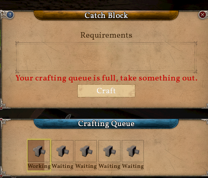 I started up a multiplayer game and I played this far and am trying to build a catch block, but when I craft it it doesn't require anything, but it also doesn't give me anything so I am kindof stuck. I had another bug just before this where the quest (Smithing) wouldn't complete because it wasn't detecting that I had crafted the smithy. I just gave myself the scroll, but I can't do that every time I need a catch block.