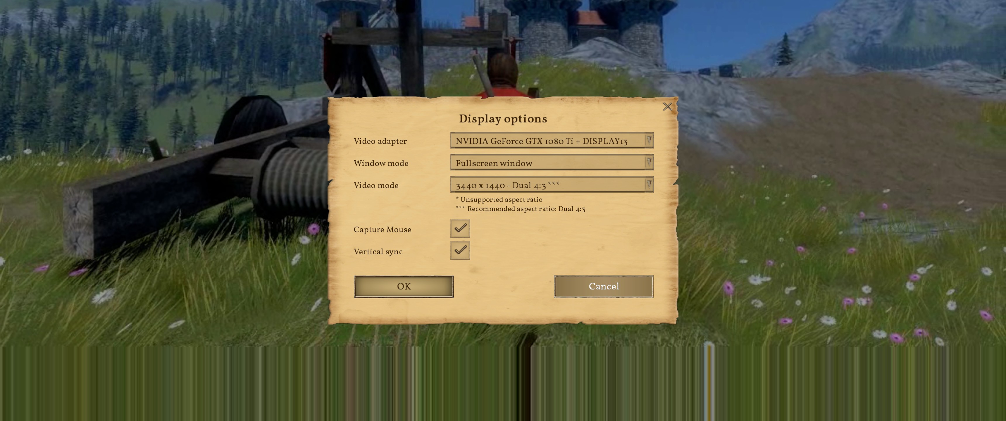 When running at 3440x1440 - Dual 4:3 in Fullscreen or Fullscreen Window, the bottom ~1/5 of the display is just a vertical smear. This doesn't happen at lower (non-native) resolutions in Fullscreen, Fullscreen window, or Window modes.