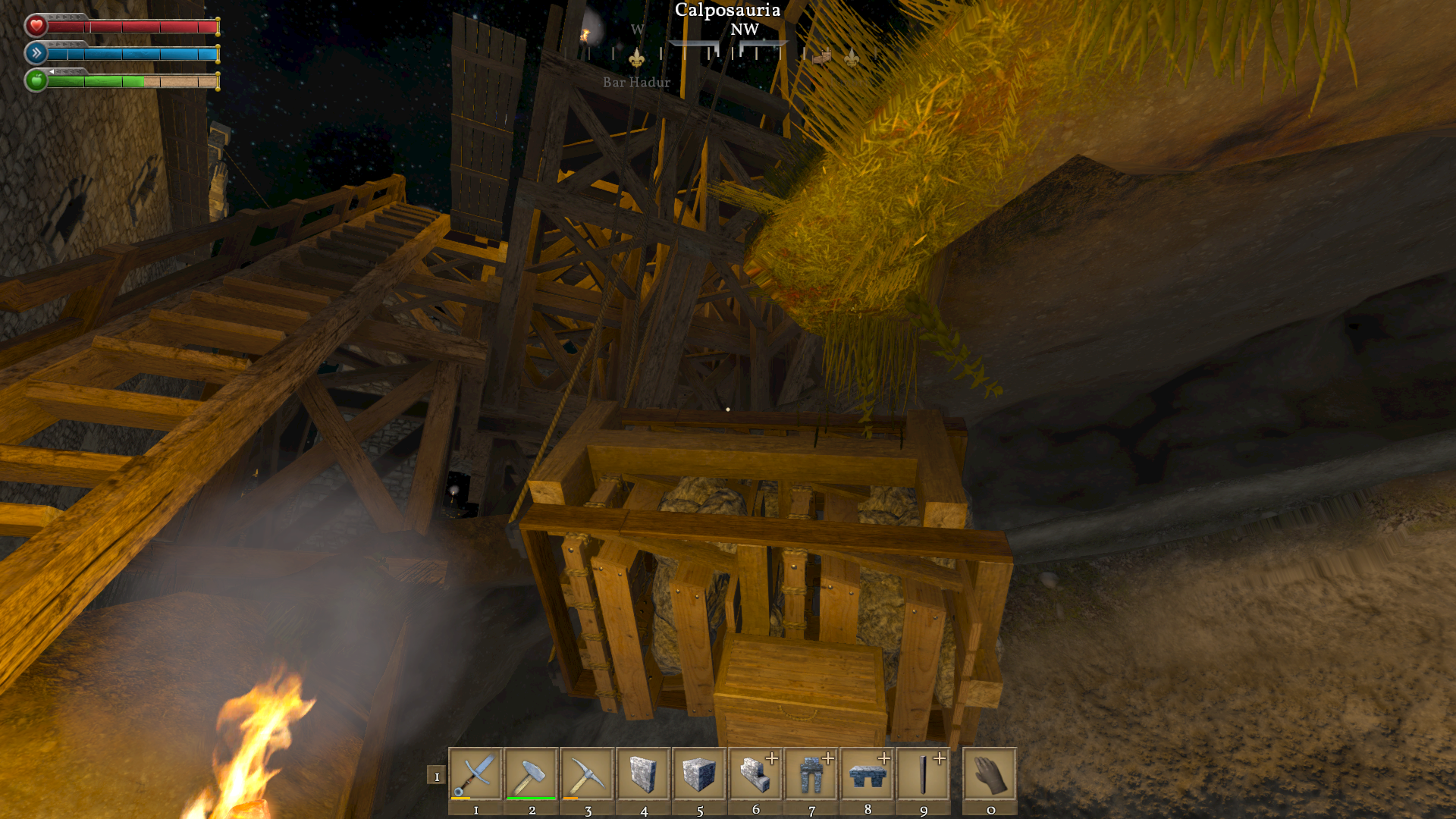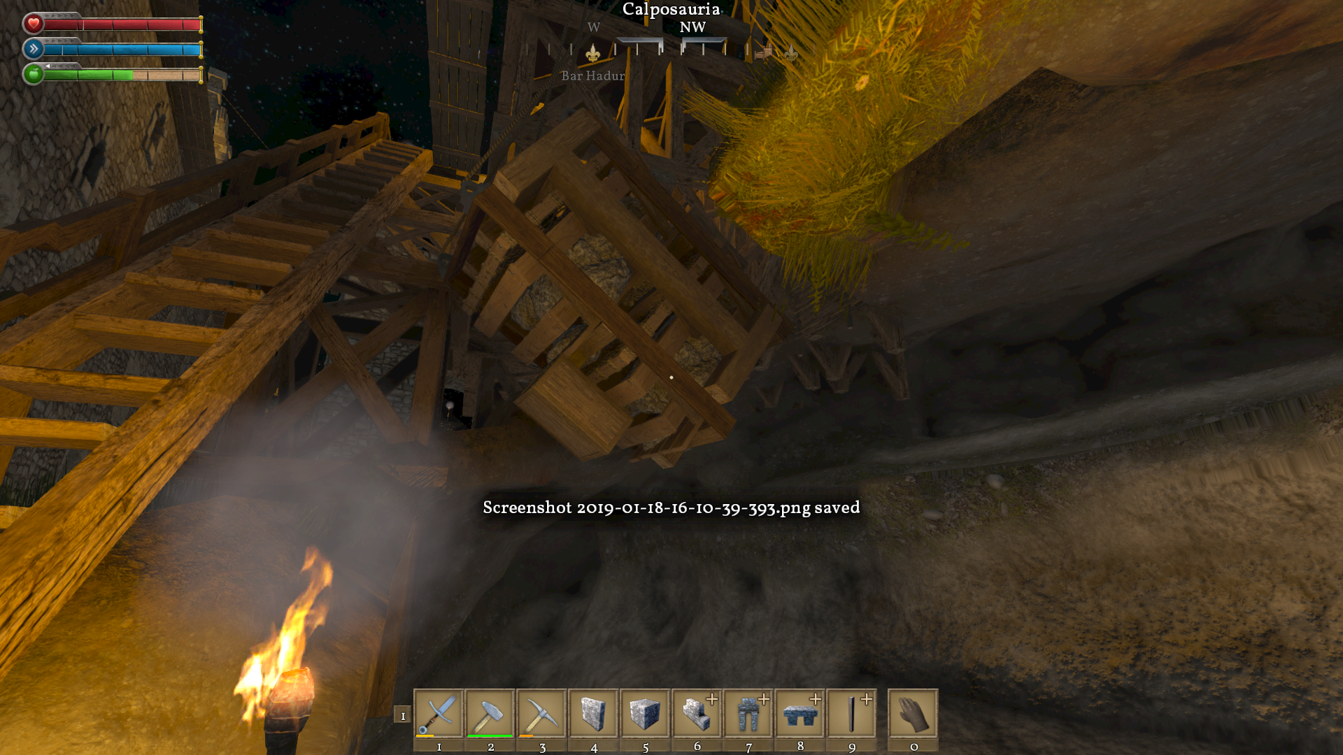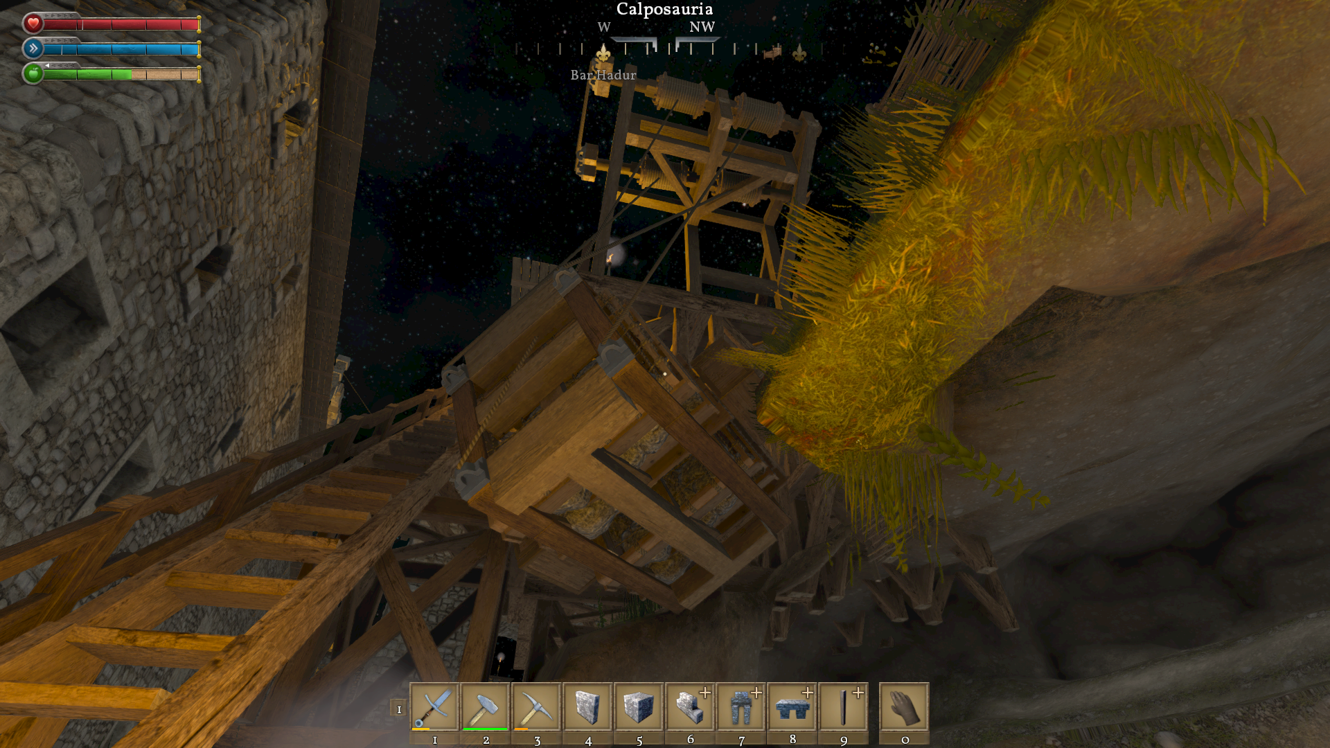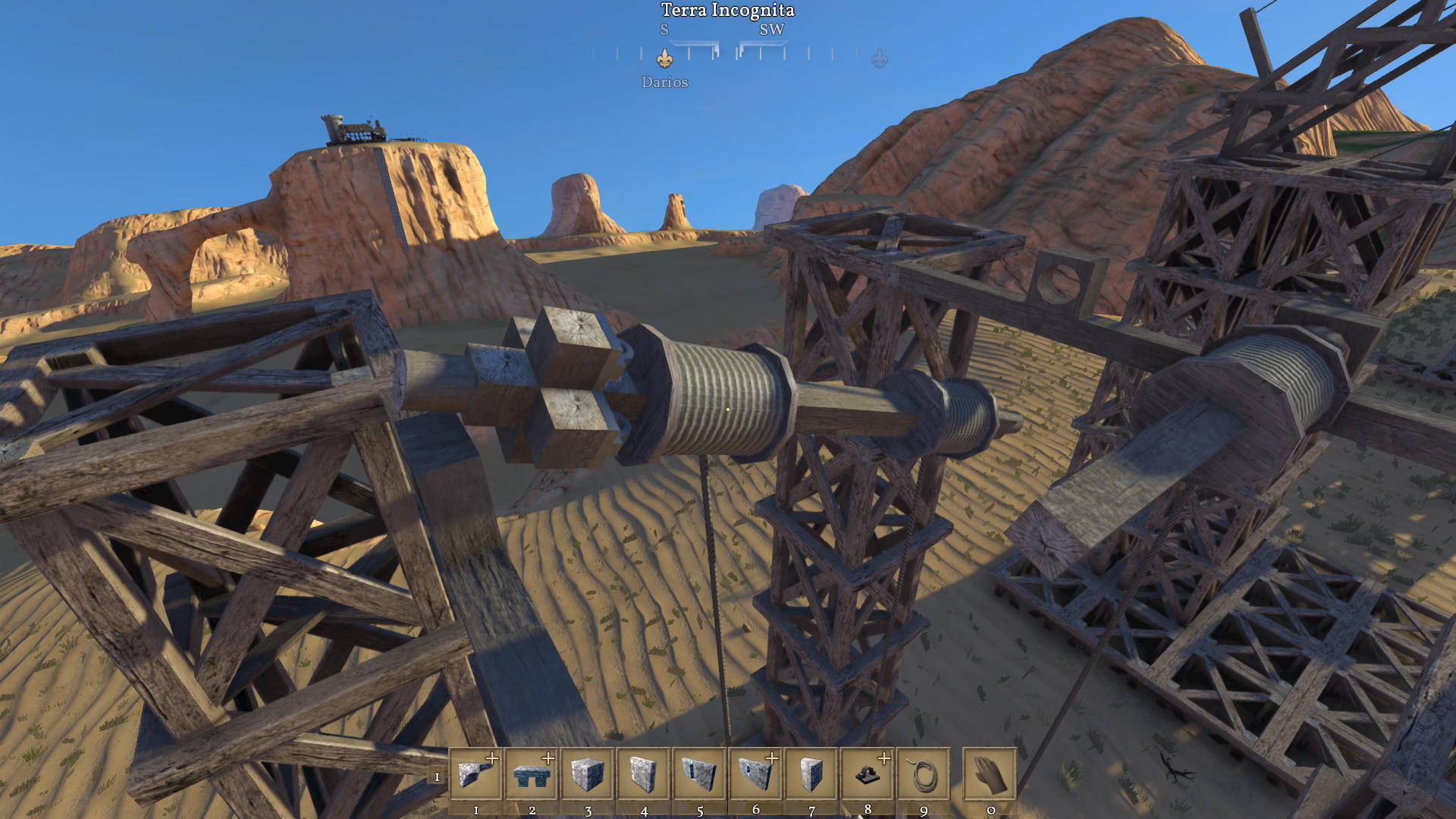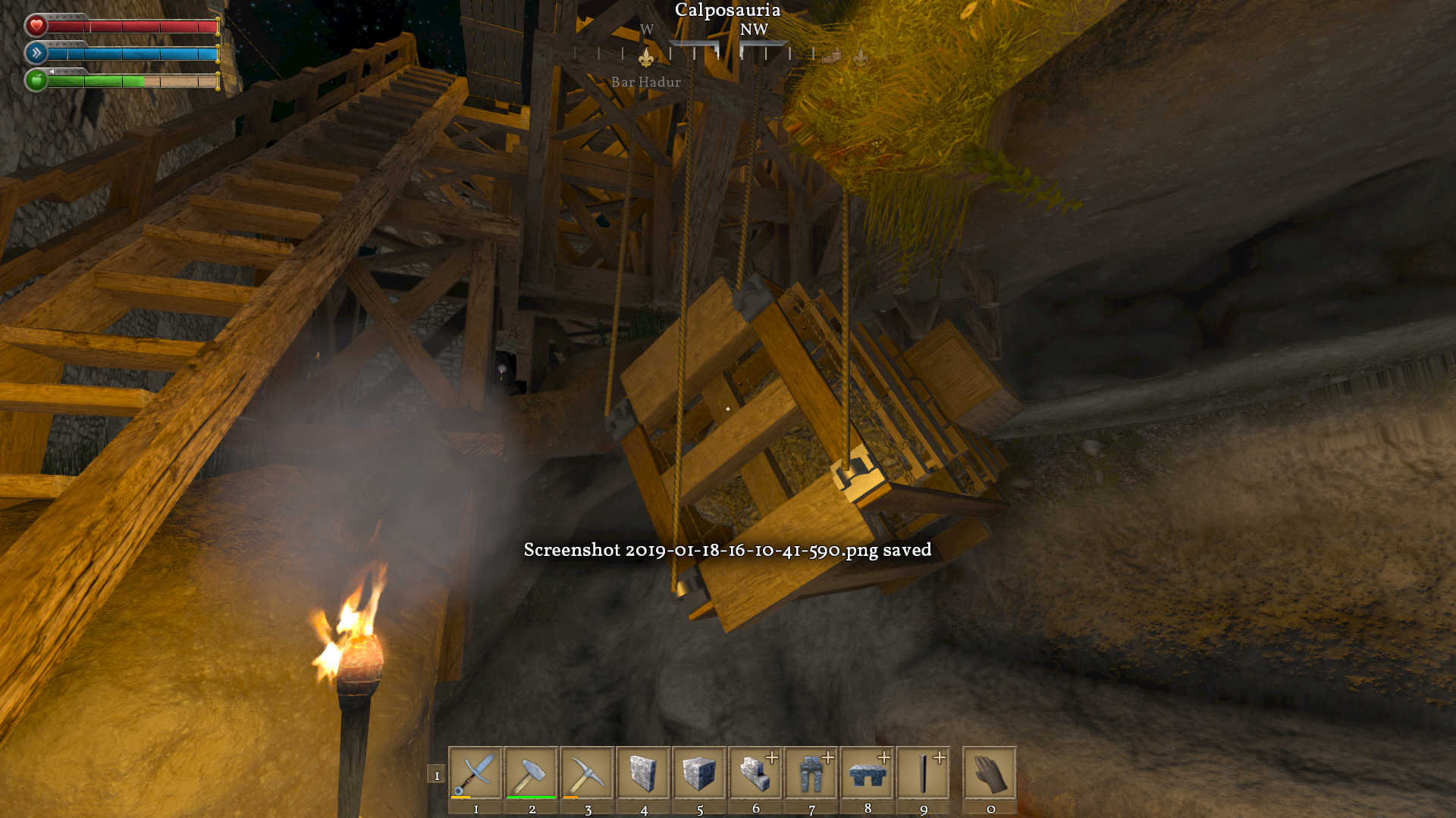 I imagine others have noticed this but I couldn't find a similar bug. This game often has physics issues that cause creations to fly about wildly. Attached images show my rock elevator bouncing about like a fish on a line and the rope drum axle coming loose after a few bounces. This often results in my rock cart exploding into component pieces. This also occurs with horizontal carts on occasion.