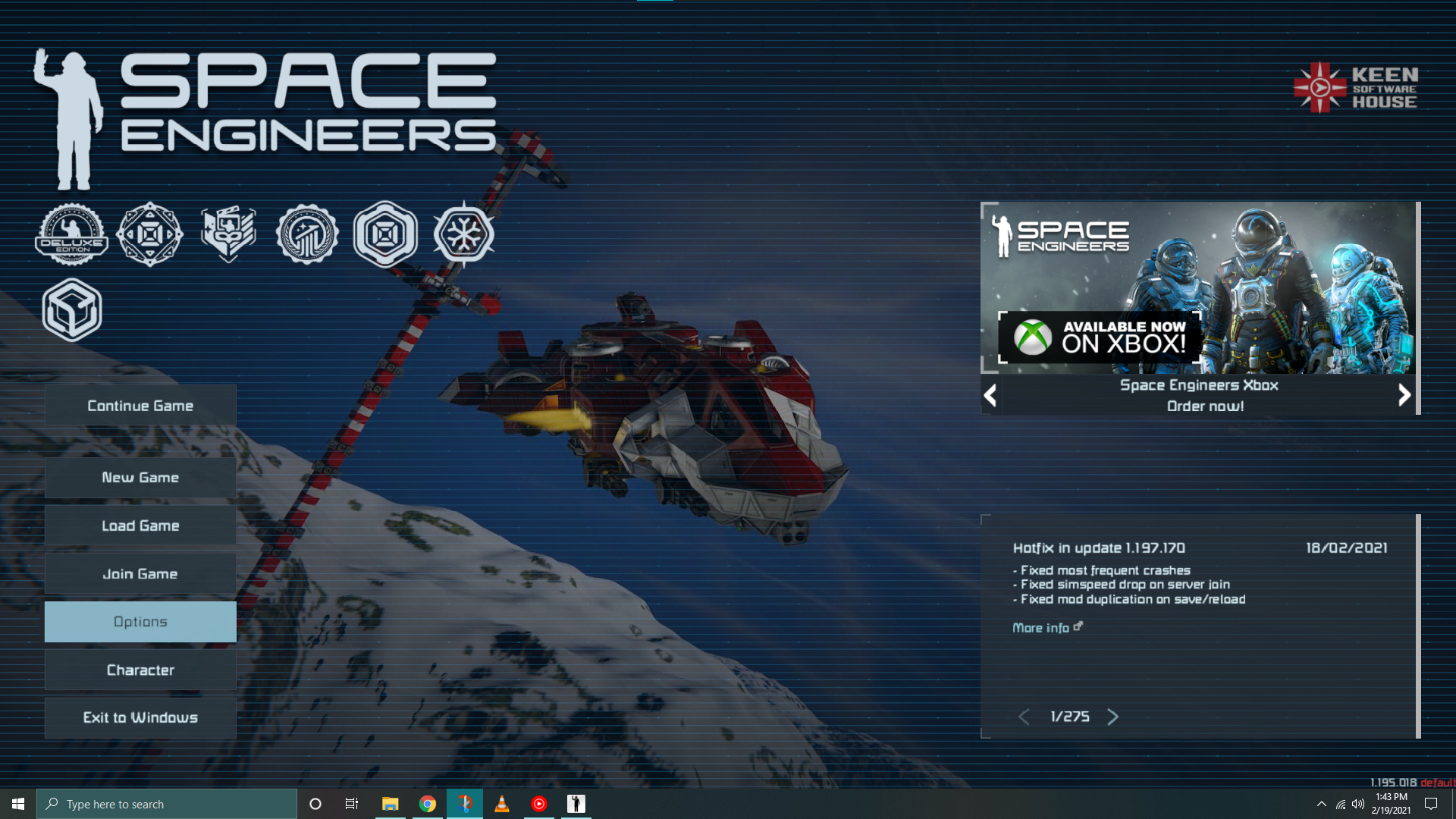 it is worth noting that space engineers (v 1.19.something as far as i remember) did work back when my system was running win7 pro 2 years ago, i updated to win10 pro to fix several other issues i was having with my system (cant remember what exactly they were but they were major system issues), after updating to win10 pro i have had no system issues whatsoever.