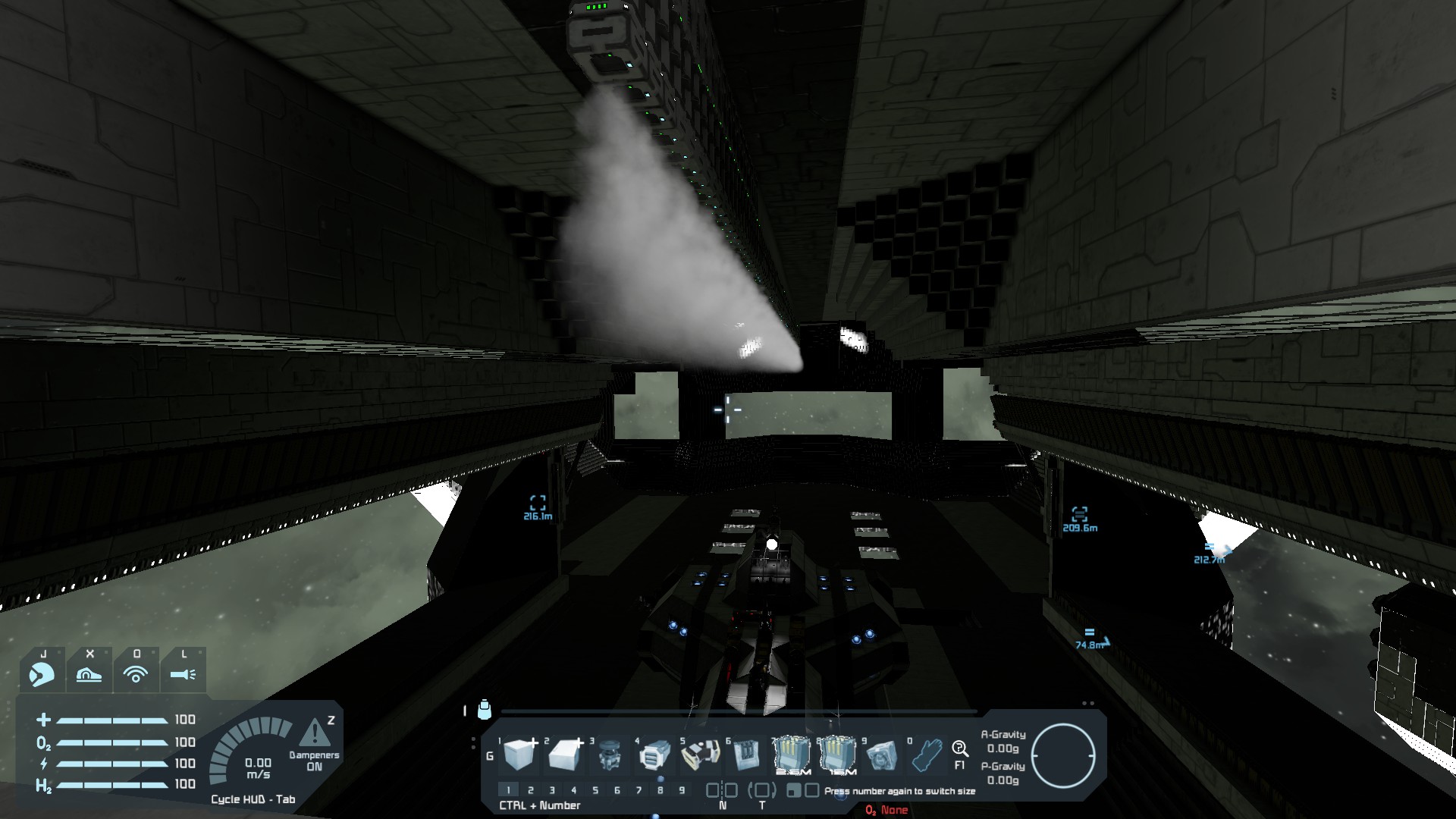 It is worth note, this is happening inside the non-sealable shell of a very large, unfinished ship (if un-geared from the single block station, it lags the game pretty bad, even without moving). It's 450 blocks long, overall- so, 1,125m. They seem to like doing this on their own sometimes, but I've found a reliable way to reproduce the problem: Close the doors, save & reload the world, and open the doors. To space.