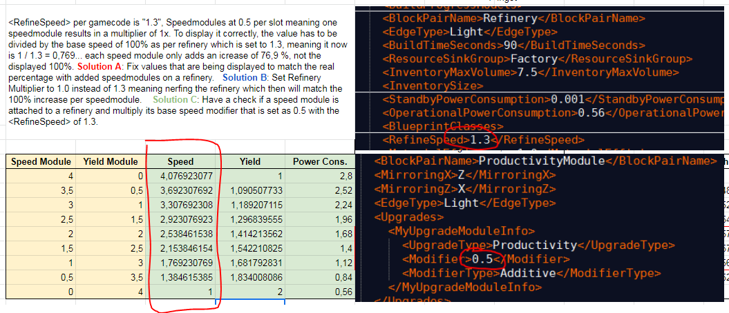 Doing testing ingame has shown me that values were changed but what actually caught my eye was that adding Productivity aka Speedmodules to the Refinery wouldn't match their speed as displayed in the Refinery info in menu.
