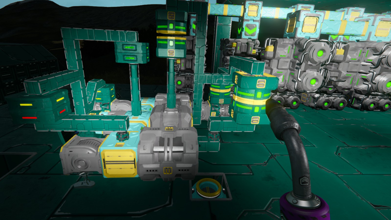 The large hydrogen thruster on the left is built on a hinge and has a merge block on one of its sides. On the right I used a rotor to try the same and on the middle I used a piston.