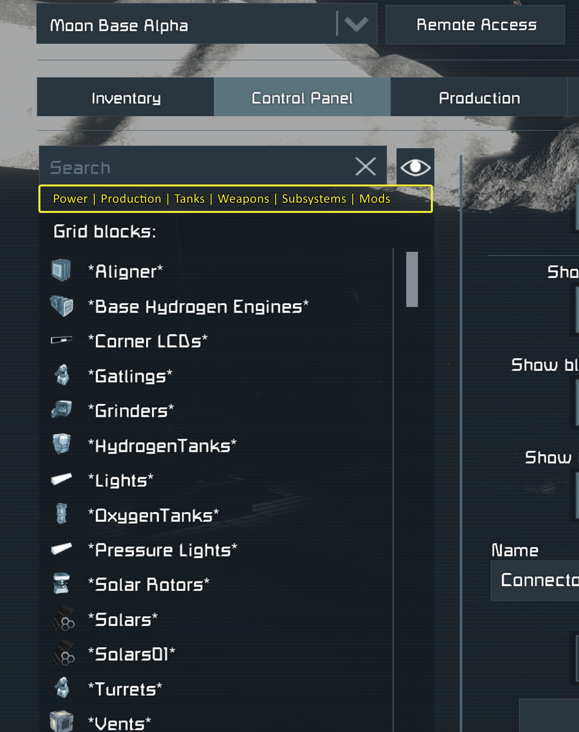 - We have only had CTRL + ALT 1-9 since the game started, and block count is ever increasing. - Filtering in grid control panel: (steam screenshot or see attached below)