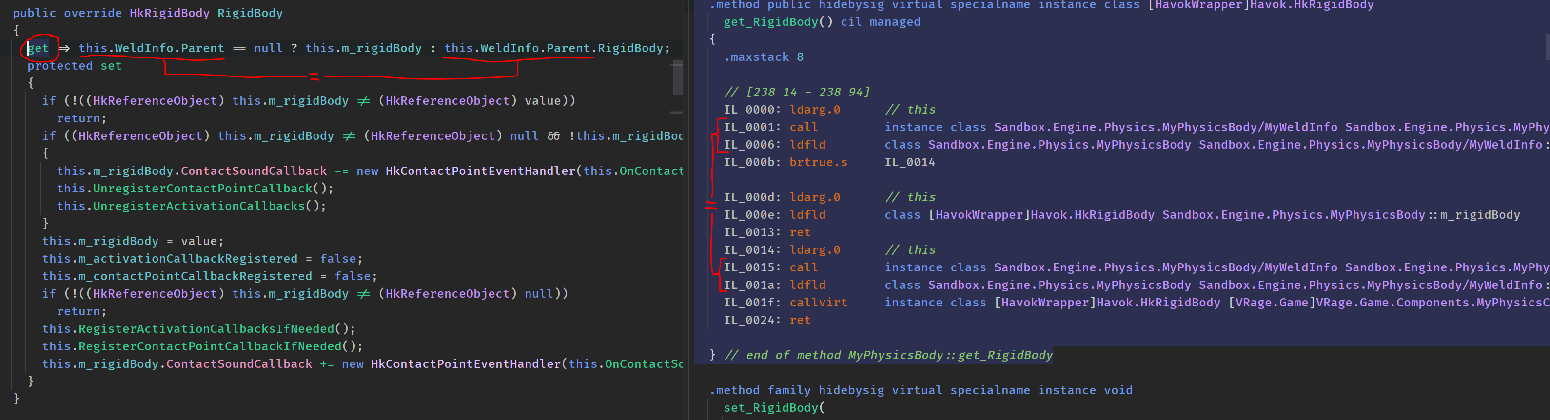 The getter of the MyPhysicsBody.RigidBody property has redundant code: