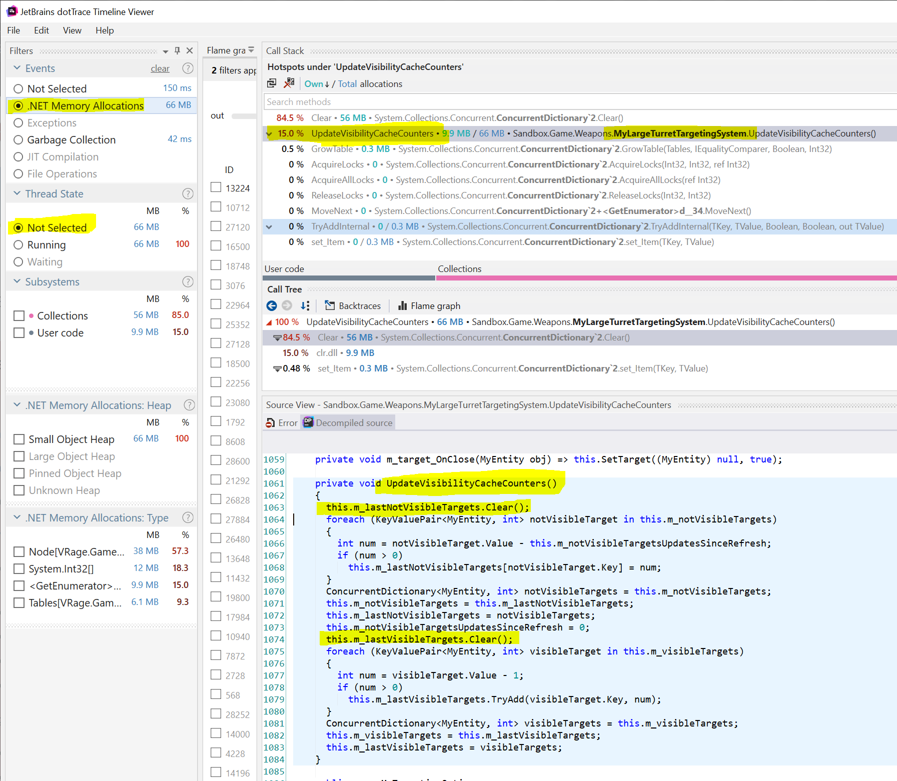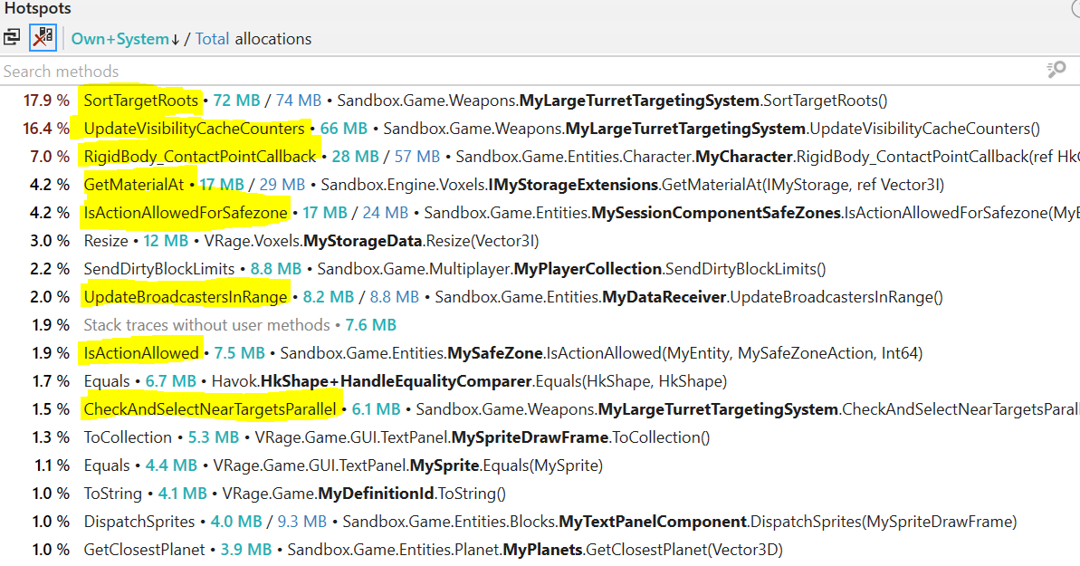 Sorry, you're experiencing these issues. I will admit I don't have a huge amount of knowledge of dotTrace but have followed your instructions. When viewing the hotspots afterwards, I'm not able to see a mention of the targeting system that you have in yours. Should I be doing something in-game to activate this? I apologise for what is probably a silly question. I'd like to get this reproduced but so far after multiple attempts, this is not showing for me. Any tips in the right direction would be excellent.