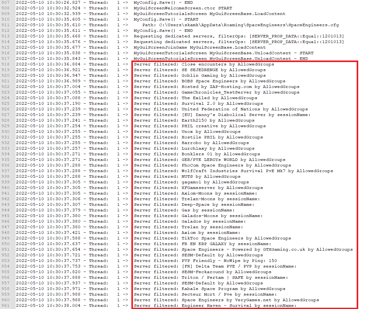 Unfortunatelly, you still have enormous number of filters in the log. Since the deletion of cfg file did not clear it, please do in manually in game: Join game – Favorites – right click on the server name – Remove server from favorites, if you have any there.