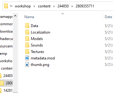 The Numbers in <Name> and <PublishedFileId> are both the mods id, which is also the name of the folder in which they are saved in. For me the mods are saved in H:\SteamLibrary\steamapps\workshop\content\244850