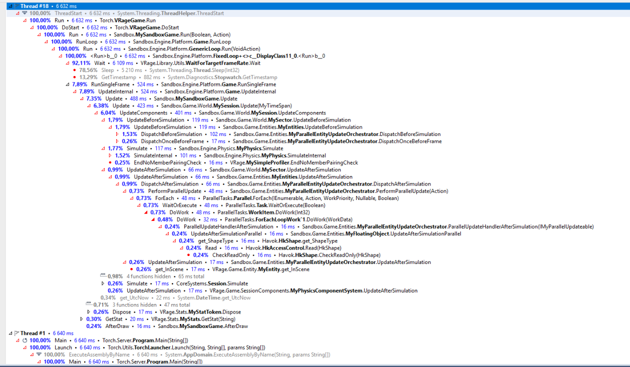 In the game at the moment, all physics, damage calculations, the work of turrets, miscalculations of factories and so on are calculated on one core. It's not strange, even when playing on the server, my 6-core processor is not loaded in almost any way, except for one core that is loaded at 80%, against 2-3% on the rest. On the server, this situation looks even sadder. When playing more than 20 players, calculating all the server physics in one thread for say Xeon E5 2689 becomes a problem, and considering that all this is on one core, the rest are idle. If you open the load on the cores, then we observe this picture. The game engine constantly uses 1 core that counts all actions on the server, the rest at this time count some remaining actions that do not particularly help unload the main thread. Thus, it turns out that if we have 2 conditional servers, the load will be on 2 cores, and the remaining 14 threads will just rest (with 8 cores / 16 threads). Accordingly, we get problems with simulation on the server at not particularly high processor frequencies. Although it would seem that the processor can provide this due to the number of cores, but alas. The situation in the game on the client side is absolutely identical.