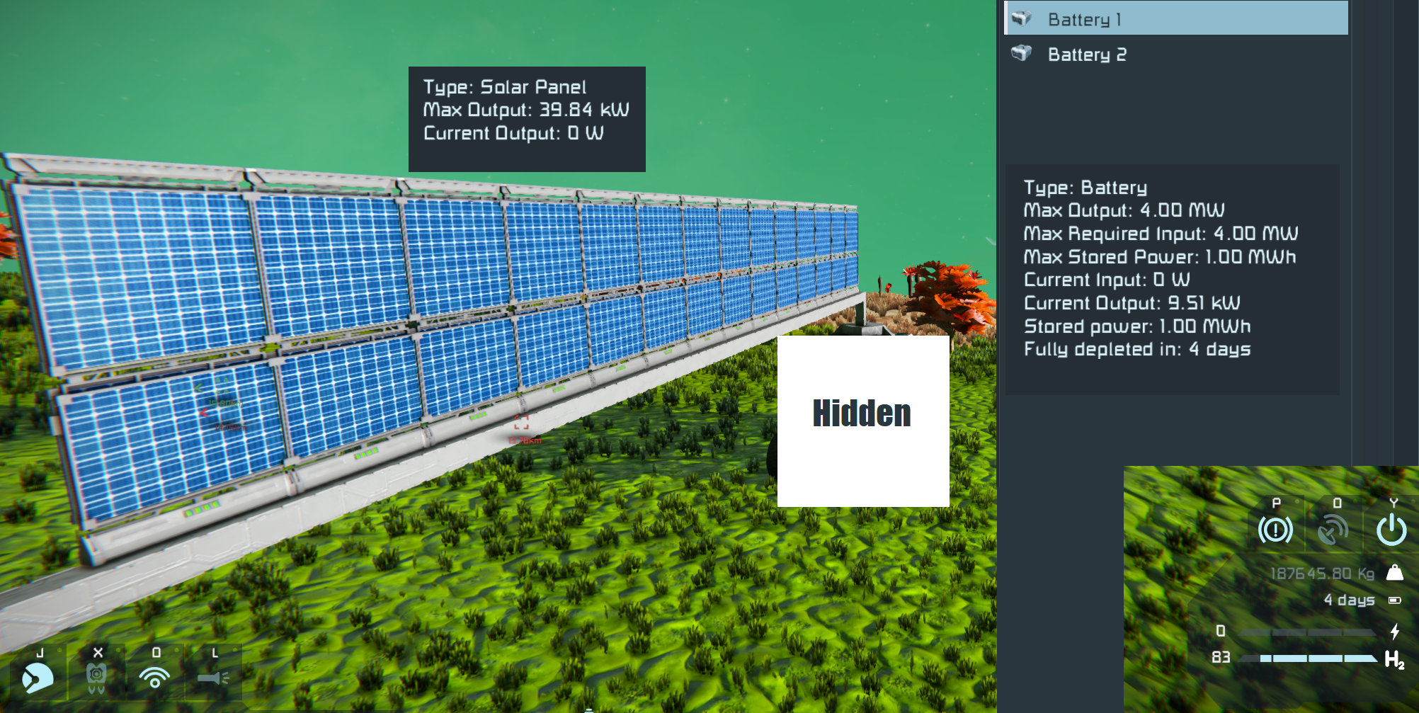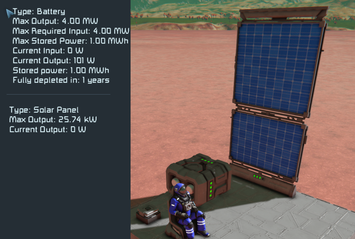 Hello I just discovered that the small grid solar is not recharging the batteries on my new small grid design. It only has 2 bars remaining on the 2 internal batts and even when in direct sunlight nothing is being outputted from the panels to the batts and they continue to be used for the ships power. Shouldn't they change the time remaining for the batts from (in my case) 4 days to the symbol - showing there's no time limit currently? This is confusing a bit when working out issues for survival settings.