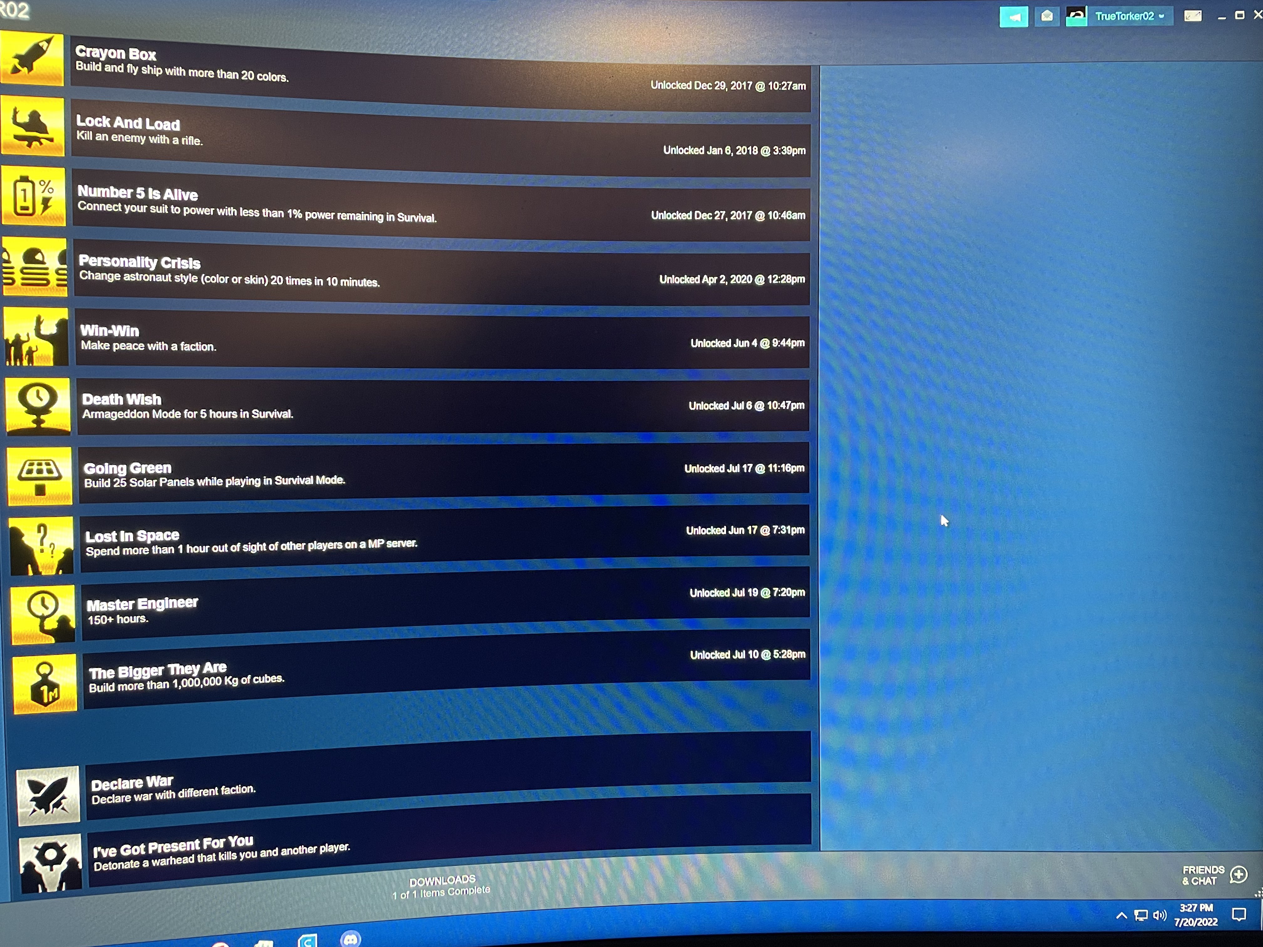 Hello, I'm reaching out due to an issue I'm having with the Space Engineers Achievements on steam, steam support directed me here. I've been playing SE since 2017 and really enjoy it, recently I have been trying to get all the Achievements. I have completed most of them, but I didn't get or lost the achievements and my progress on many of them was reset. The save/'s being used is just a regular save with no mods or exploits, I haven't completed the scenarios recently, I am in progress with some of them, but I do remember completing a few of them some time ago this was on a previous computer I no longer own and don't have the saves. When I was reviewing what I needed to finish I realized after completing "The Bigger They Are", all my progress was removed from "The Harder They Fall", "Giant Leap For Humankind", "Explorer". The "I've Got Present For You", "Declare War", "Master Engineer", "Millionaire Club", and "The friend of the factions" were Removed from my Achievements. I believe I also had "The Story Begins", Promoted Engineer" and "Engineering Degree" but I don't remember 100%. I have since restarted my progress on these, I was lost on "Master Engineer" as I had at this time over 300 hours, I randomly re'received the achievement 9 days later (Attaching picture proof of this). Only "Explorer" and "Giant Leap.." are tracking progress as well. "I've Got Present For You", "Declare War", "Millionaire Club", and "The friend of the factions" I've redone, some many times, "The Harder They Fall" has not tracked any progress and is 0/1,000,000 despite me making progress on it. I will be continuing to try and Reachieve these, help with this issue would be greatly appreciated. My Steam User is TrueTorker02.