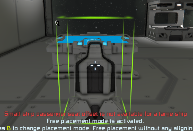 The passenger seat is a great tool for practical uses such as seats for transportation vehicles and hangers for warships, but it also has decorative purposes as well like for chairs around a table, seating in a theatre, and generally anywhere you'd have a seat. However, the game only has a small grid variant of the offset passenger seat so it is impossible to put seats next to objects like a console block or table in a large block grid.