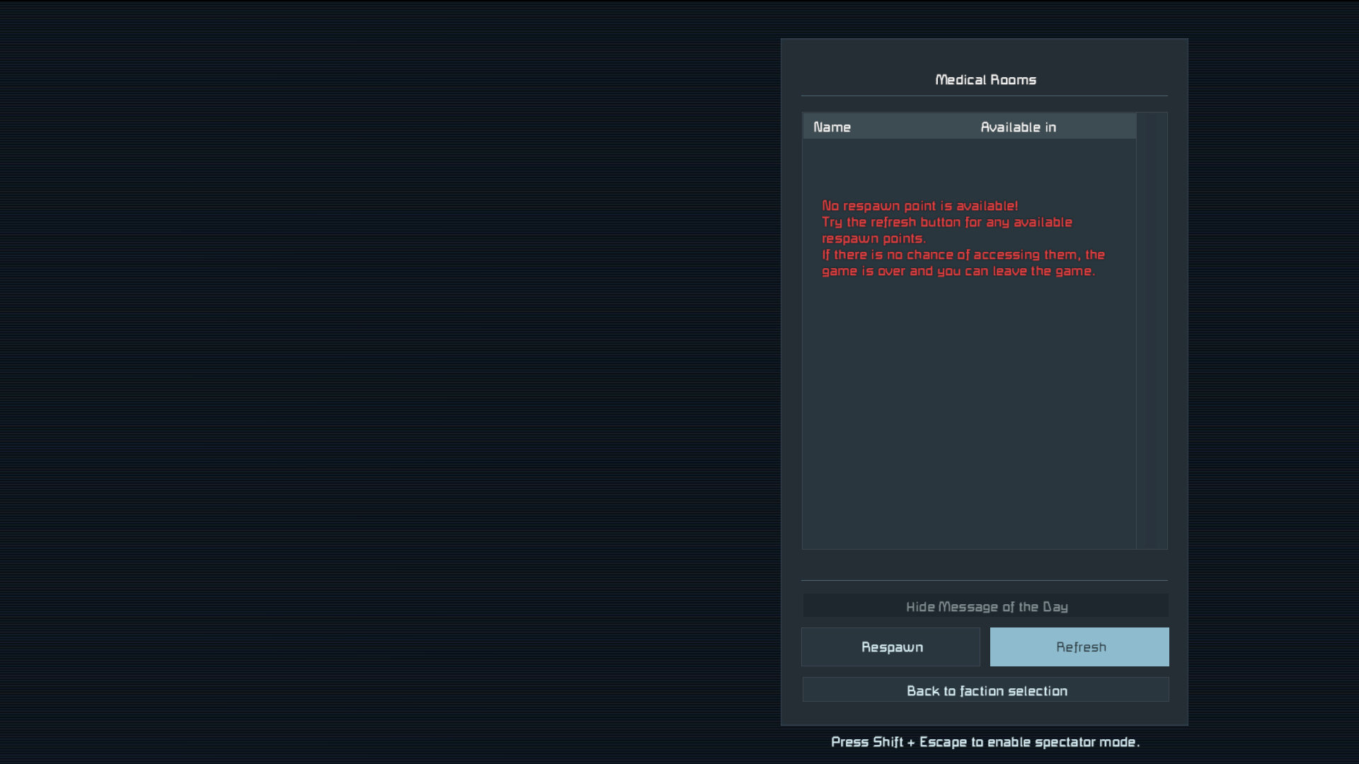 Currently it is not possible for me to spawn. all respawn ships are not listed and even the suit spawn doesnt work. respawn is enabked, respawn ships are enabled and no mods installed
