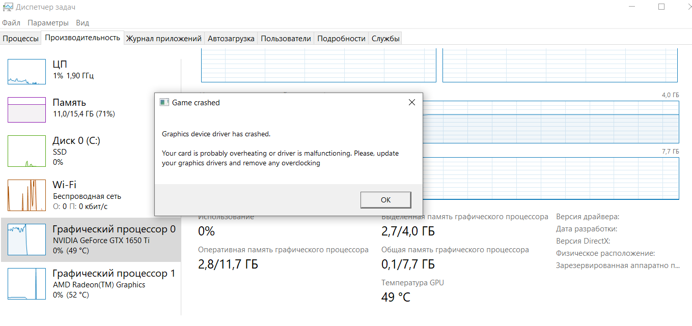I think the problem is in my laptop, but I can not figure out what. Sometimes after the game crashes my video card disappears from the system until I restart the laptop.