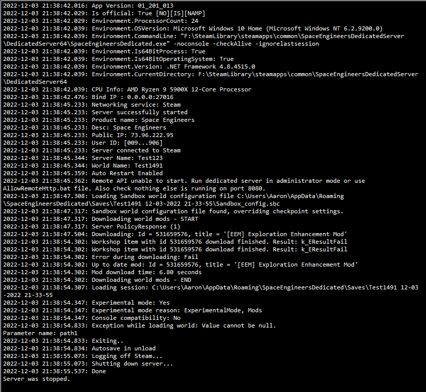 Currently trying to just start a small local server for some friends and adding some mods we all want. Have tested starting the server without the mods and works fine, add one mod and will shutdown and restart in a loop. Read other posts of same/similar problem with no posted fixes working. Attached is screenshot of console,