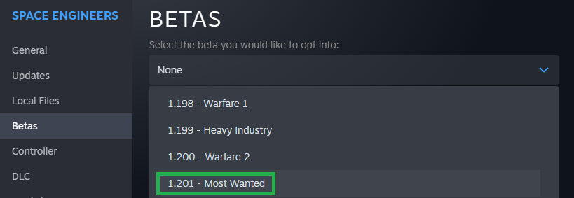 The Beta option 1.201 is not offered.