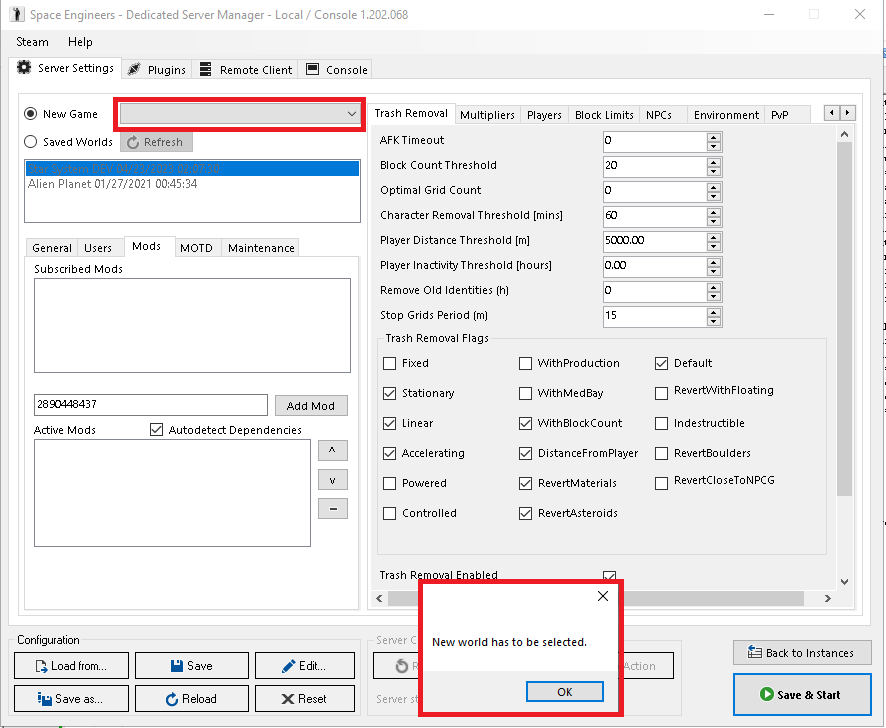 Dedicated Server/ Load existing configurationon a new world won't work "new world has to be selected