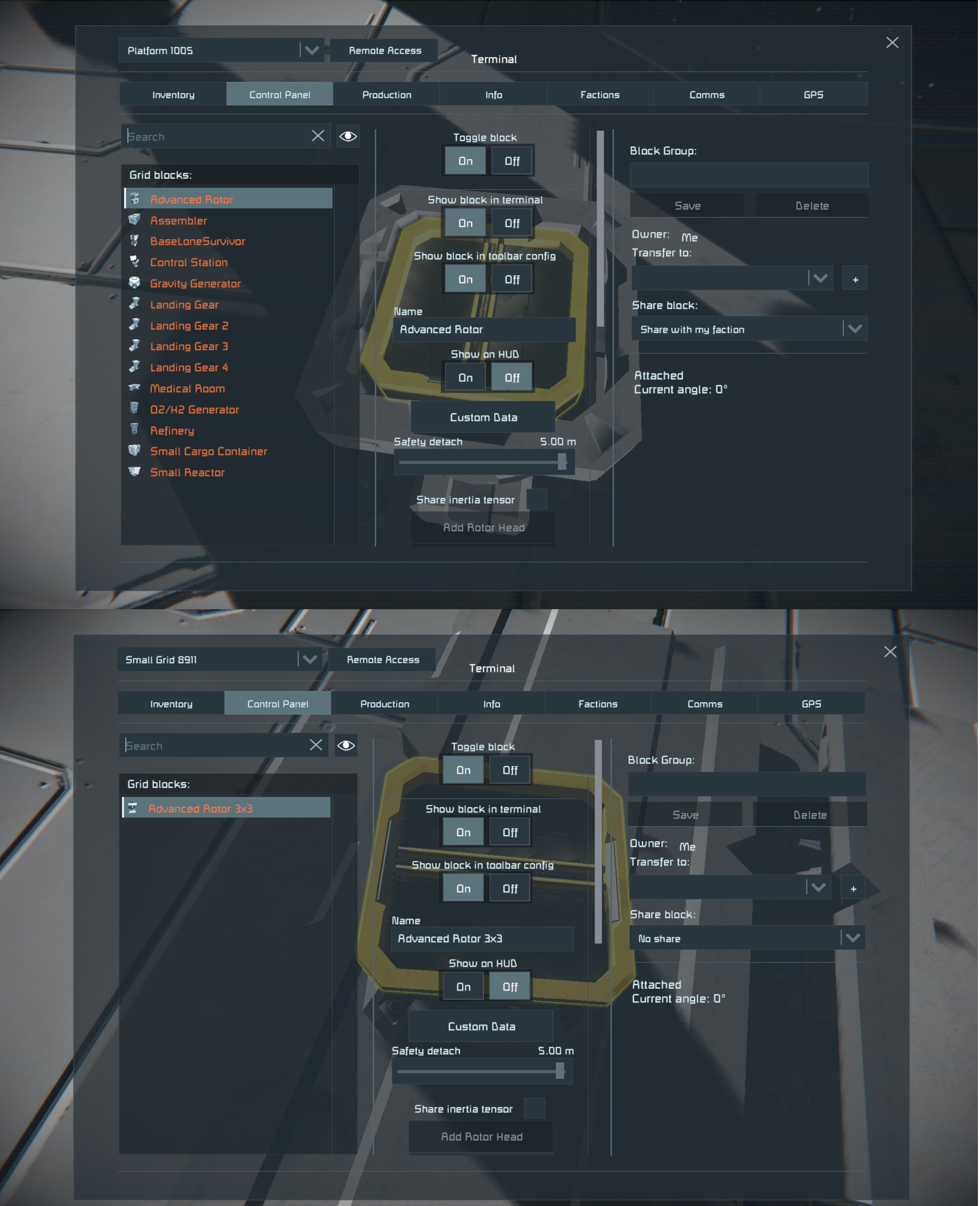 To see the bug/issue you have to have multiple advanced rotors on your grid, you will realise after accessing their terminals through the head/part that it wont go to the specific rotor you accessed but a whole other block entirely, I have a video attached showcasing this: