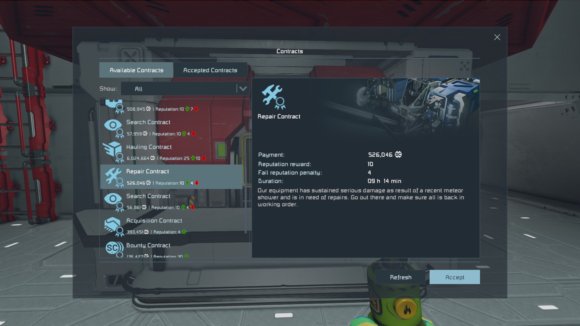 A: I'm not entirely sure which details would be relevant. I can grab the GPS coordinates of a waypoint on the station that issued the bugged contract next time I am able to get online, hopefully within a day of this posting. The object to be repaired was a satellite-like ship with 2 solar panel wings of 2 solar panel blocks each, 2 batteries, a remote control block, and I believe it was reddish in hue. It spawned in a relatively clear space around 7km away from the issuing station, with a few asteroid clusters off in the distance.