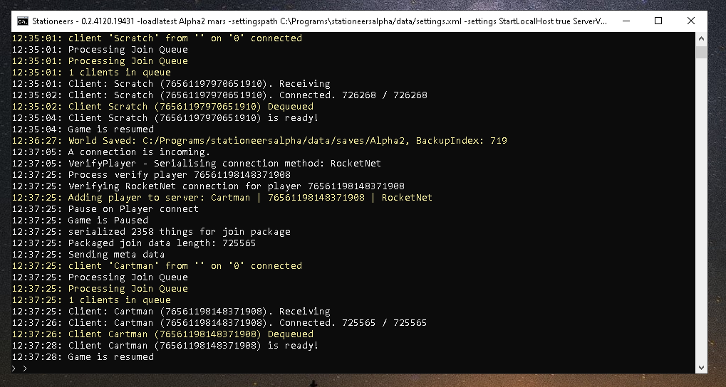 C:\Programs\stationeersalpha\rocketstation_DedicatedServer -nographics -batchmode -settings ServerName "AlphaSpace" StartLocalHost true ServerVisible true AutoSave true SaveInterval 345 ServerPassword pass ServerMaxPlayers 4 UPNPEnabled true GamePort 27015 UpdatePort 27016.