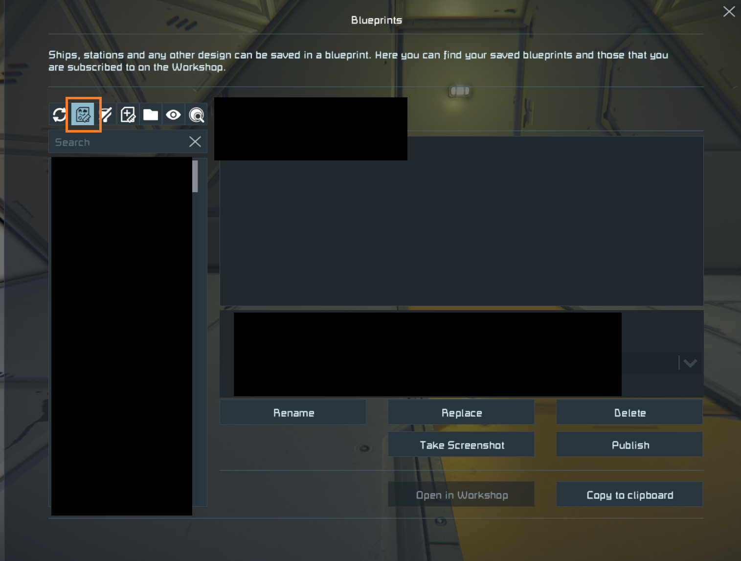 If it's about the blueprints, please note that on your image, you have the option "Show local blueprints only" enabled. See your screen and mine for comparison. You have there only the house icon. You need to click on it couple of times so you have the proper (or all) section accessible. That should allow you to see all your blueprints.