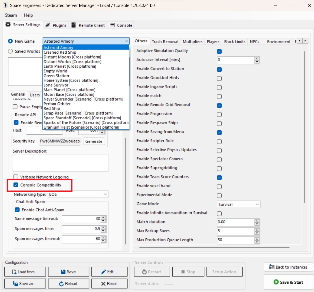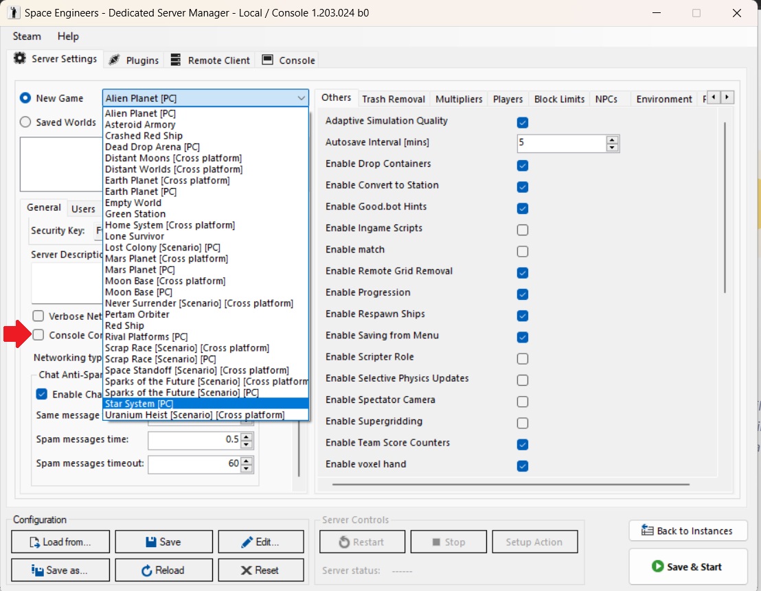 Could you please check if 'Console Compatibility' is enabled in the Dedicated Server Manager? If 'Console Compatibility' is enabled, please be aware that some worlds (including, Star System) are not compatible with consoles, the reason why they are not visible or available in the worlds list. Please find attached images for reference.