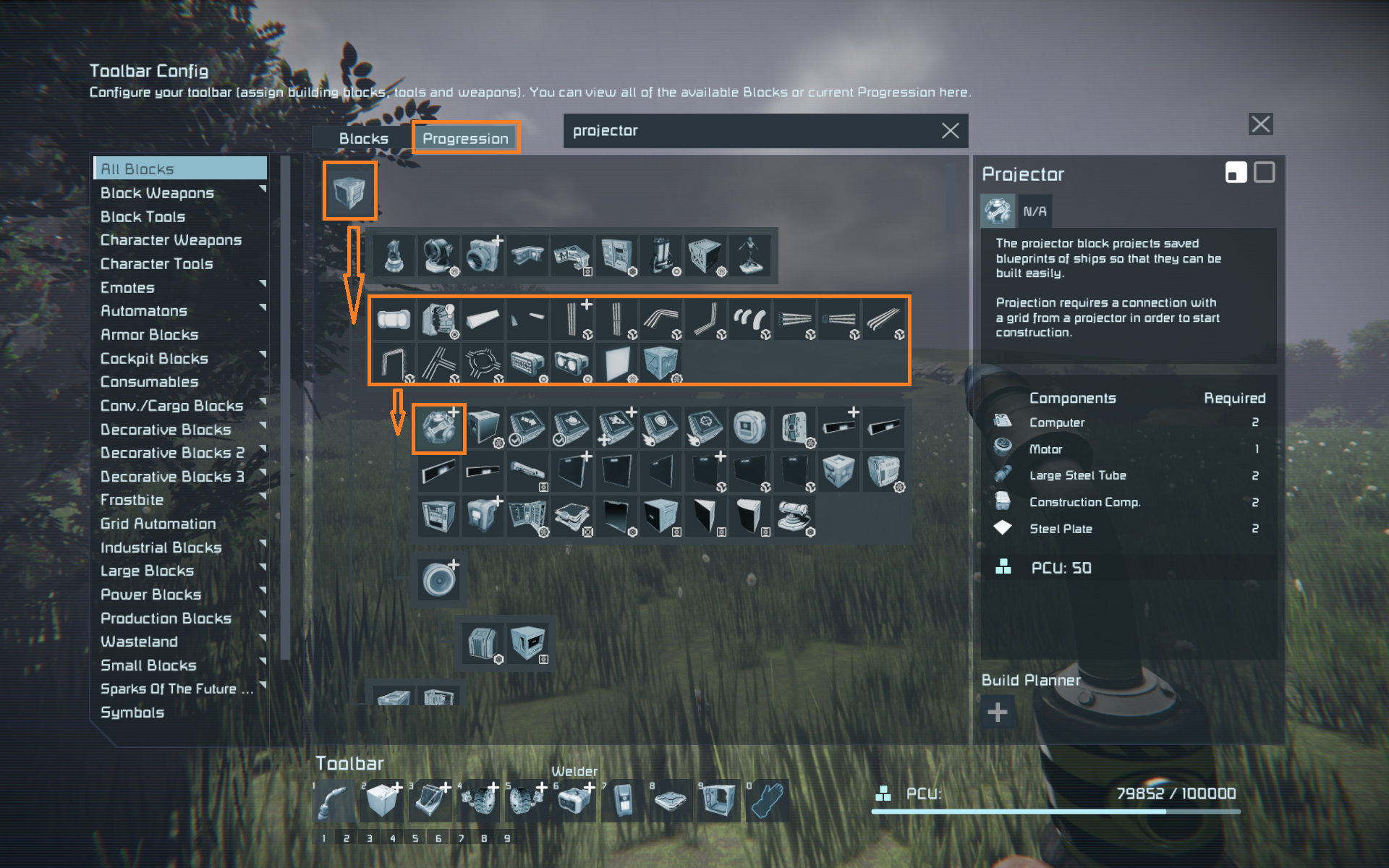 hello, im trying to use the workshop blueprint for the first time in suirvival mode, but i cant find the projector block?