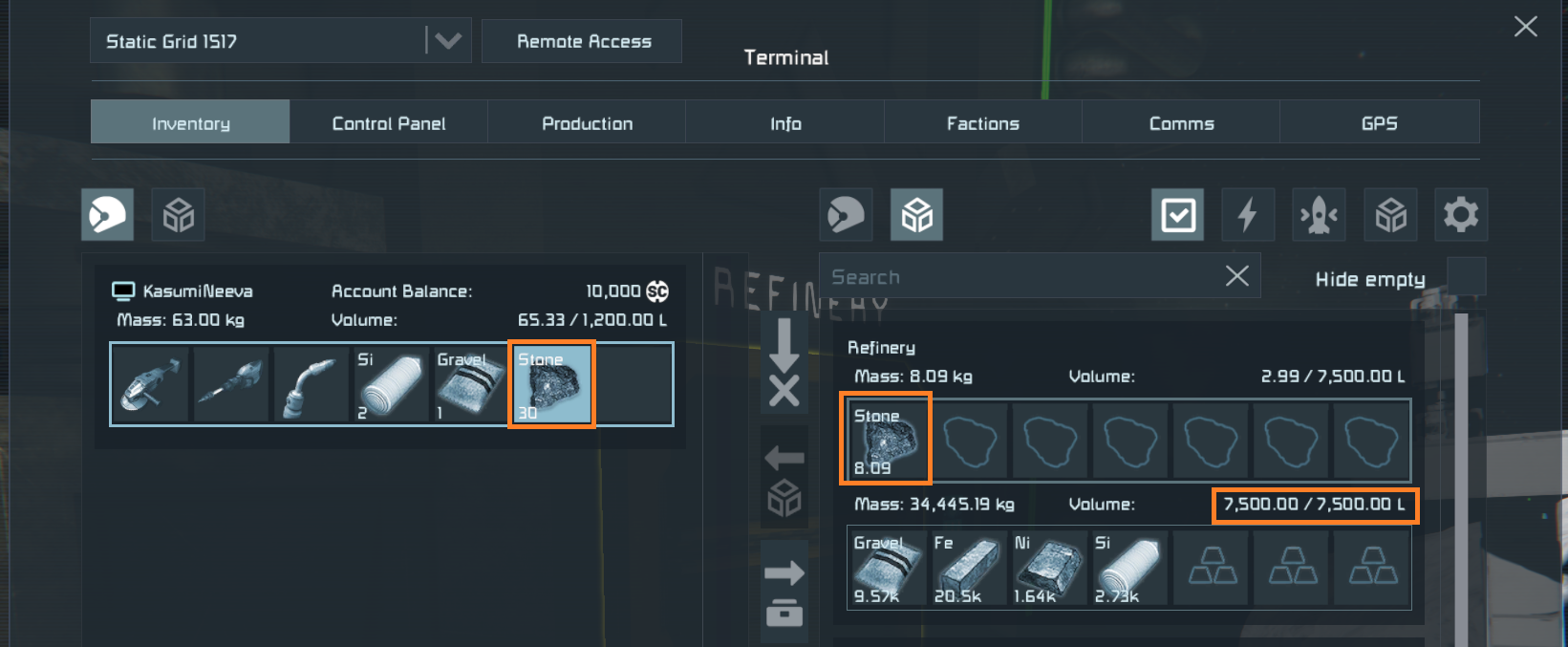 As you can see on my image, by adding stones by <10>, I did manage to fill the "out inventory" of the Refinery completely to 7,500.00 while leaving only 8.09 stones in the input inventory. That means that the last bit taken from the added <10> stones was <1.81> (I do have another 30 left in my characters inventory to add if needed).