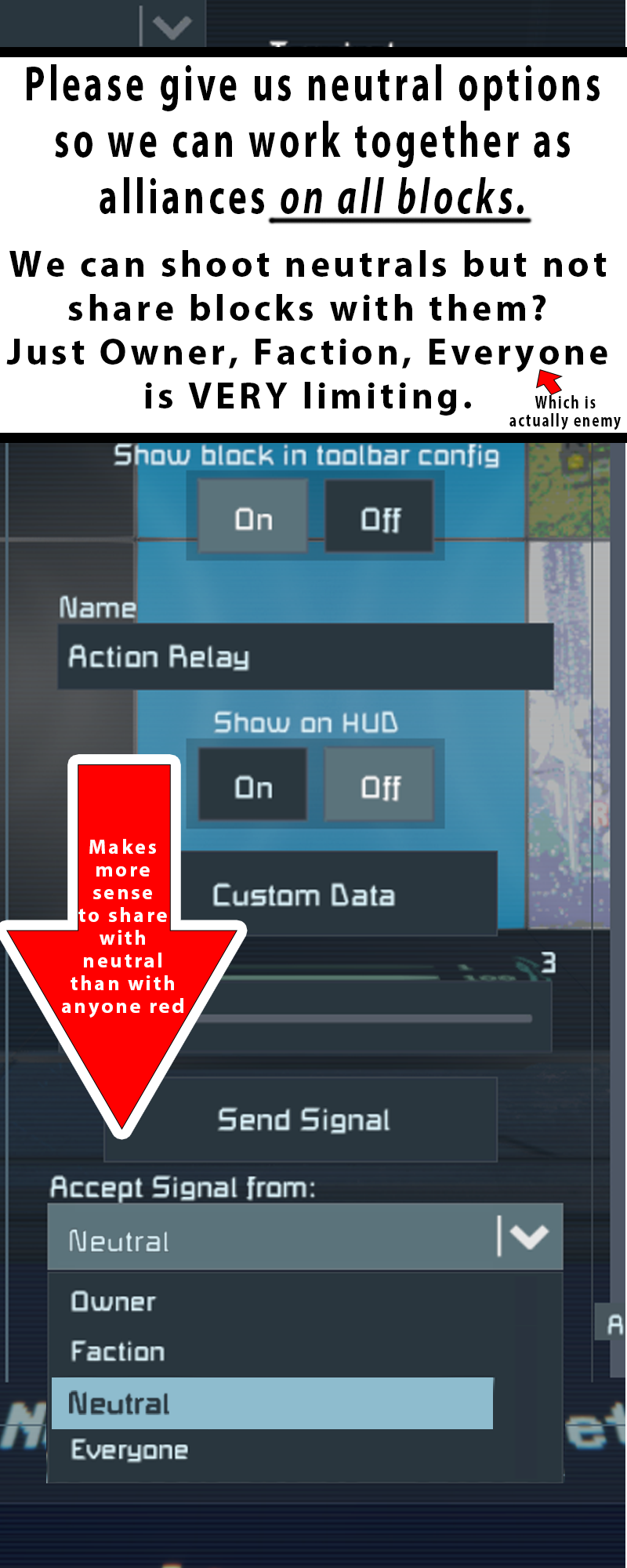 It seems strange we can shoot neutrals but not specifically share a cargo with just neutrals. Instead, we have the option to share with everyone which really means enemy. So many avenues for hostile players to take advantage of current setting options. If we have the ability to choose "share with neutral" with every block that is shareable then it would flourish a robust and detailed set of neutral players allied with each other being able to access things without letting the people they dont trust have the keys to their stuff too. I'm not sure why this hasn't been implemented since the game has been out as long as it has.