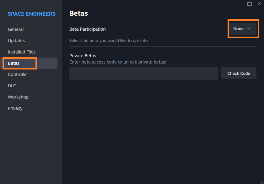 Also please be sure that you are not using any Betas (same menu as above). There should be always "None" option selected when you want to play the most current version of the game. Please see my image.