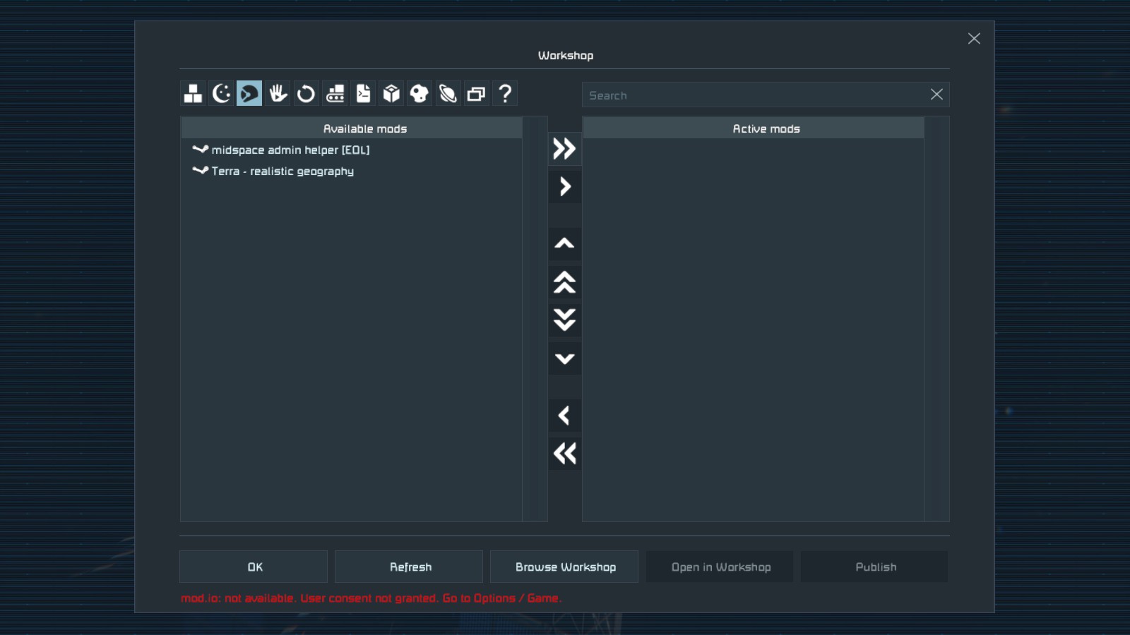 When Trying to set or edit mods added to a world/save, the screen showing subscribed mods has toggles at the top for each category, which can be toggled on or off to show different mod types - however, there is no visible indication of which options are on or off - presumably the icons should change visibility somehow with the setting, but that does not happen.