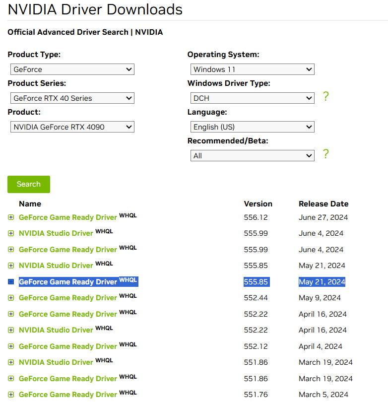 • Click on search and download the GeForce Game Ready Driver 555.85 version released on May 21, 2024 (Please see the attached image for reference).