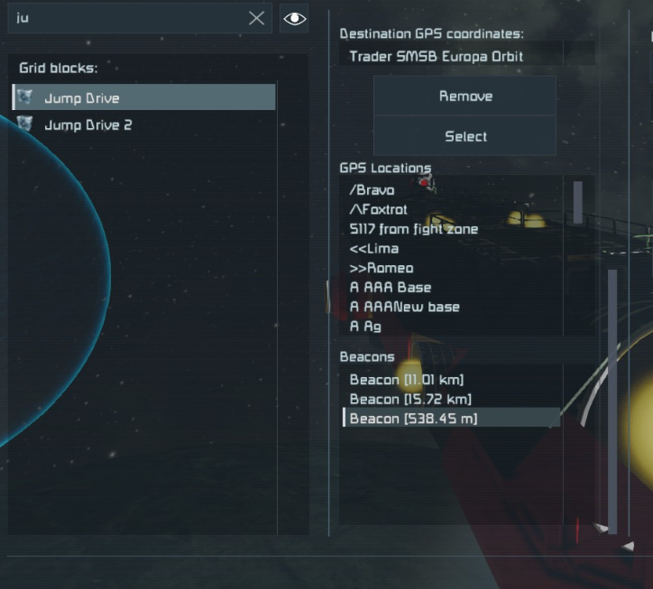 Ideally I would like to be able to look at the beacon/antenna/gps point and "lock it", then add a simple function to the jump drive to jump to the selected point. Rotate your ship to look at desired point, lock it and hit the hotbar slot number to start jumping. And to be fair, locking a point can be useful in countless other ways. H key could switch to show only locked point. Sometimes the amount of antennas and beacons around you is just too overwhelming. Another way is to be able to trigger AI behaivors based on locked target. There is already locking feature in the game, but for some reason it is not working on distant gps points. The sapce travel in almost all other games involves this simple thing to lock the remote target and start moving/jumpong/cruising/whatever towards it...