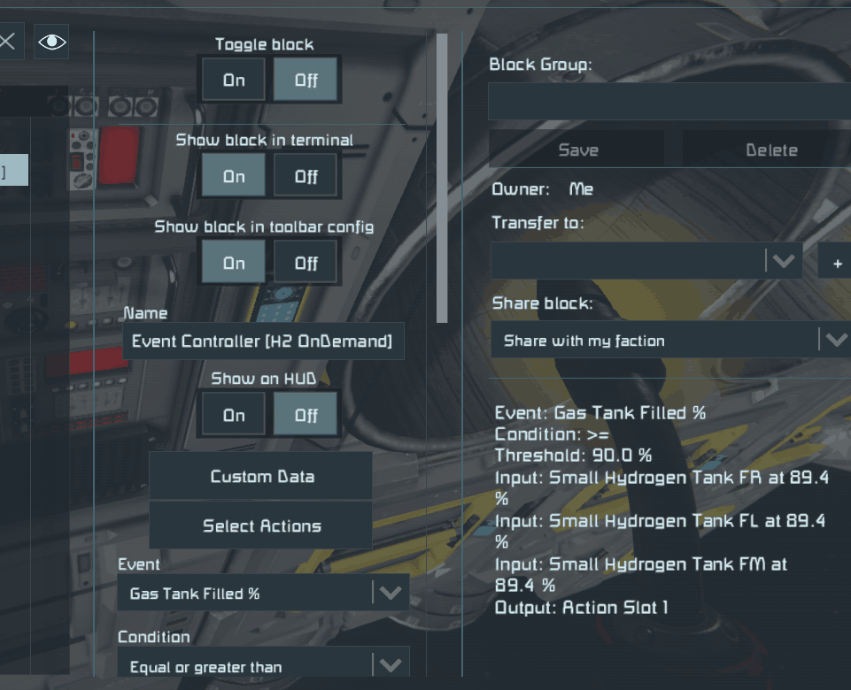 I have a hydrogen-based miner that consumes ice for power and thrust via H2/O2 Generator (5 count) and "H2" Engine (1 count). Seems like typical stuff, no problems there. What I couldn't bare was the INSANE energy consumption of the H2/O2 Gens when only doing 1/10th the work needed to support the "H2" engine to make power. To counter the INSANE energy drain for next to 0 actual work being done, I set up an event controller to turn on the H2/O2 Gens when any small hydrogen tank (of 3) is below or equal to 90% so they remain topped off. What ends up occurring is the production capacity is greater than the consumption of the "H2" Engine leading to rapid flipping on and off of every H2/O2 Generator leading to hyper consumption of ice, where an entire small cargo container is effectively deleted in seconds, but without the benefit of added hydrogen yield for the amount of ice destroyed