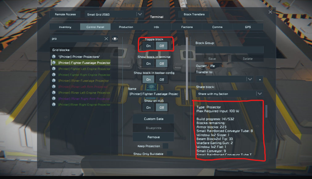Hi there! I'm attempting to create a ship factory in creative, however I've run into a snag where I have projectors that turn off and on when specific buttons are pressed. Example, if I want to print a fighter, I press one button and the fighter projector turns on, but a miner projector turns off. If I want to build a miner, I push the miner button, the miner projector turns on and the fighter projector turns off.