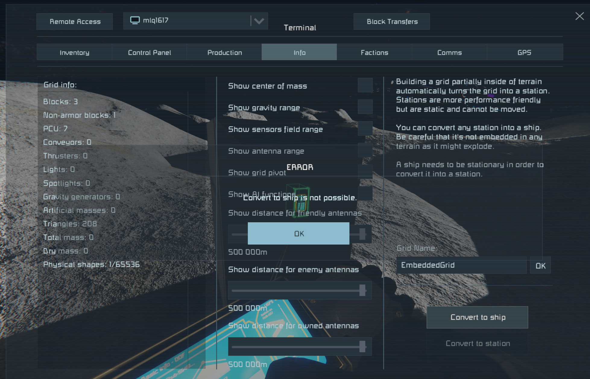 If there are other reasons that a grid cannot be converted to ship, those reasons should also be plainly and clearly outlined to the players as well, such as if the grid is beyond the maximum size for a non-static grid (is that a thing? It should be if it isn't.)