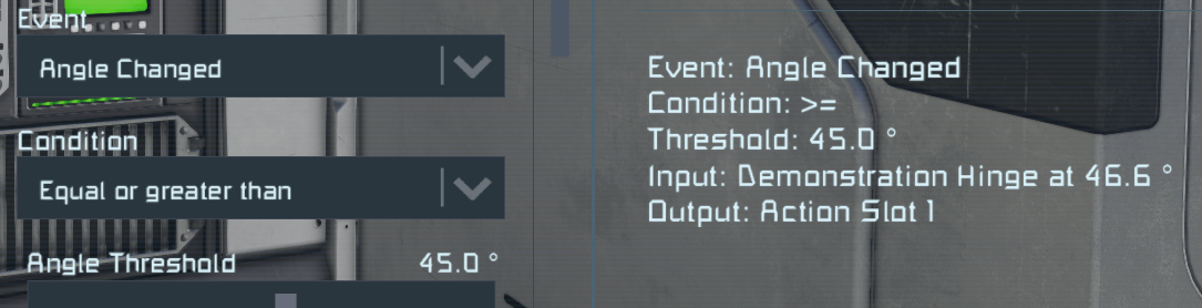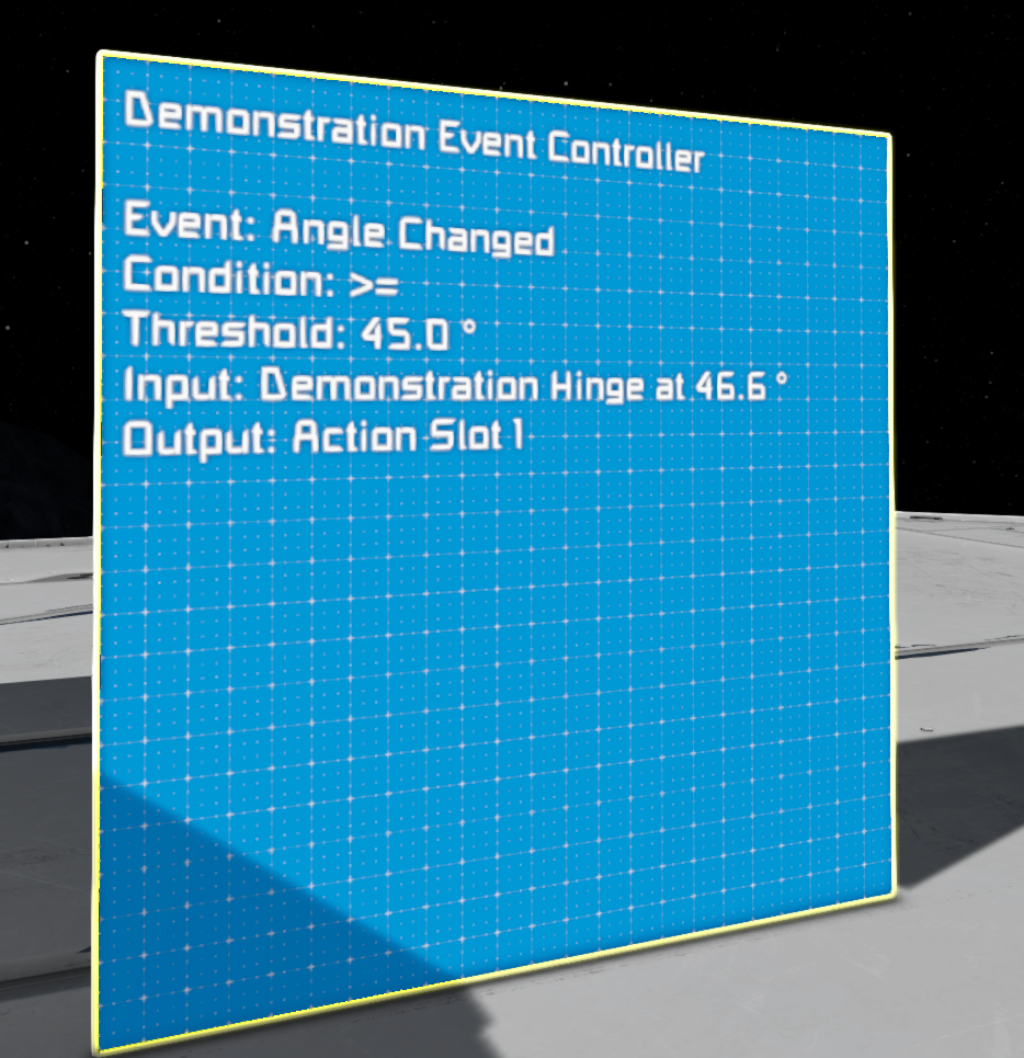 The resulting new feature that I would like to see, is for the player to be able to choose display surfaces from the Event Controller, and for the text information in the Event Controller's infor panel to be rendered on those displays. This allows the player (the Engineer) to monitor their Event Controller behaviour on screens, in cockpits, etc. I have attached a mocked up screenshot of this (Resulting Feature.png).