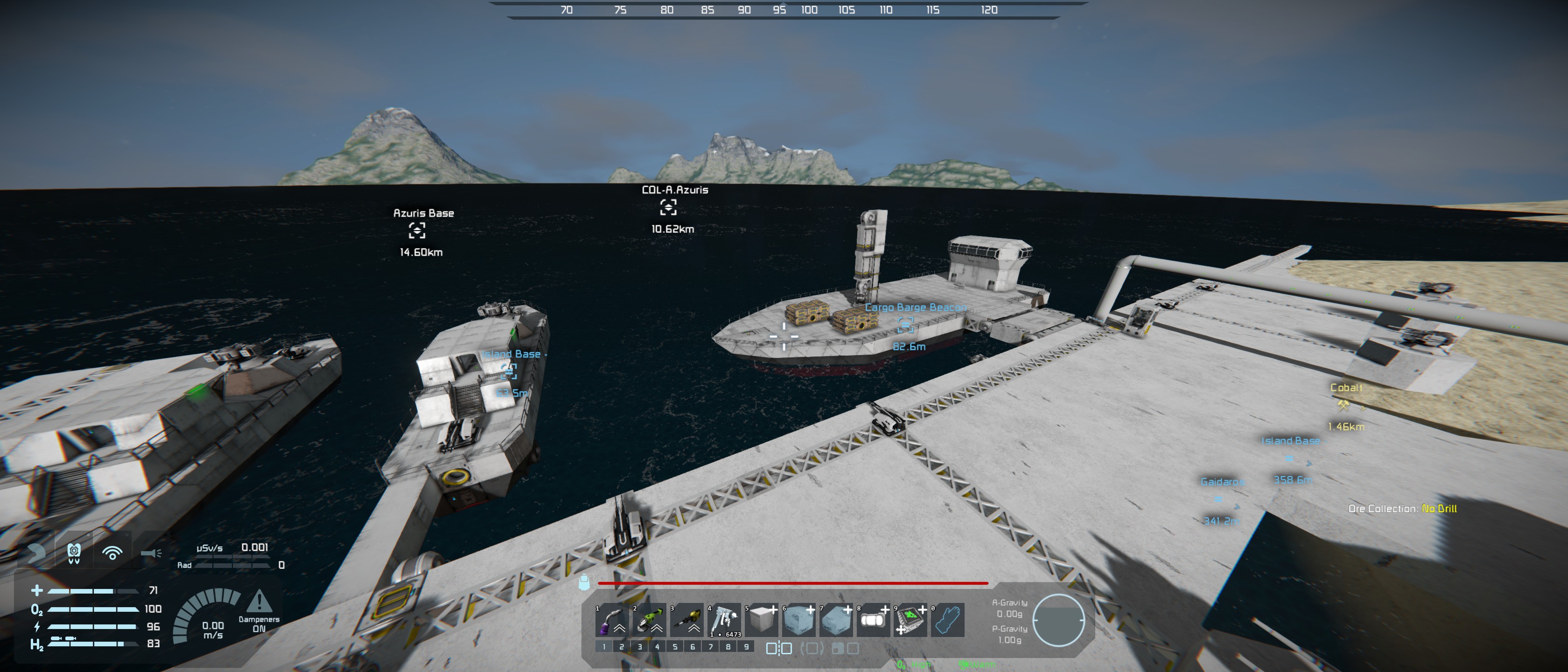 As the title says, this occurs when welding up a powered Off Ai basic block with behaviour turned On. This AI block is set to follow the beacon on the barge in the image, it is attached by a connector as such a sub-grid not sure if that is part of the issue. The Ai block is being built on the patrol boat second left in the image which is connected to the the main base (Static Grid). The base and patrol boat do not have any active AI move blocks and the other boat on the left is not connected.