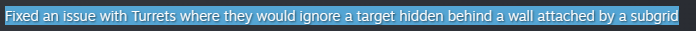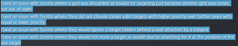 The newest Apex Survival update has made an "fix" that completely ruined camera drones with tracking for me. I made Starship Replica in Space Engineers and for Booster Catch and Starship Catch I used 2 camera drones that follow the stages as they return back with custom turret controller with assigned camera that followed Autocannon inside the stages, that got covered inside by sub-grid to cancel the tracking so It can later on track the Starship for catch, and it worked flawlessly. But with new "bugfix" that "Fixed an issue with Turrets ignoring target behind sub-grid wall", it completely messed up the drones where one is tracking Ship inside Mega Bay 2 (Ship Storage building) trough wall and it completely ignores the returning stages with exposed Autocannons, and 2nd drone tracking the already caught Booster (with covered autocannon by sub-grid) instead of Ship, making me unable to get almost any views. Only thing I would be happy if You did was either, Removing this "feature", or adding optional switch for tracking targets behind sub-grids. I and some other camera lovers would really appreciate that. I'm looking forward to an answer.