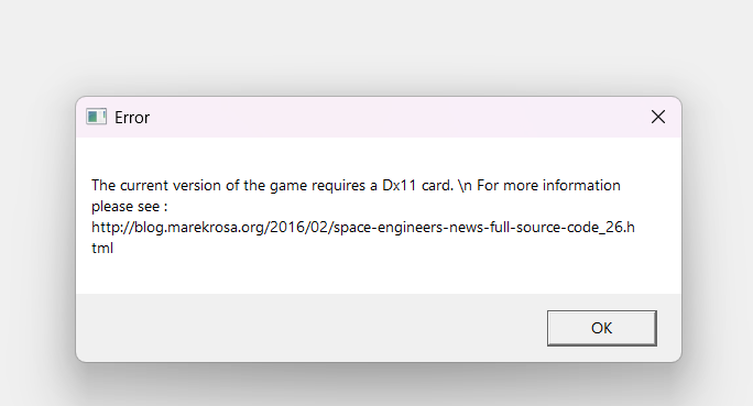 When I try to launch Space Engineer's from the desktop icon or steam after pulling up the initial screen the attached error occurs. I have verified my files and 6 failed initially and steam fixed it and didn't show any verification failures. I tried to reopen again and the same error message popped up so i tried restarting my computer incase that was the issue. After the restart the launch issue persisted and I can not find a solution. My computer has a 4060 and before 4/28/2026 was running space engineer's perfectly fine. I love the game and want to keep playing it
