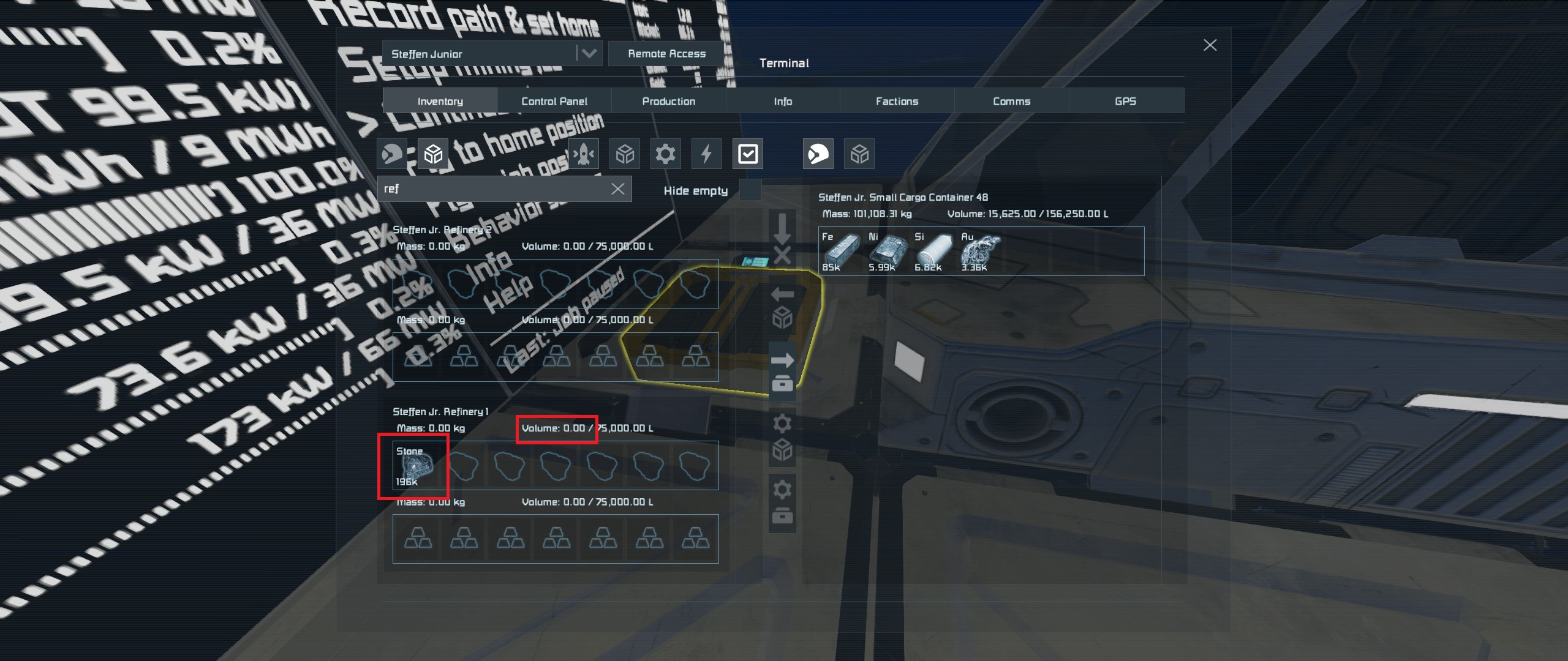 Two players reported still seeing the refinery inventory churning trough ores while me and another one couldn't (but volume worked). After a relog and some more play it flipped again and only one of us could see/access/move inventory properly. All blocks are set to share with faction and every now and then we switch ownership of all the blocks back and forth so that we can do some recoloring but everyone has access to everything.