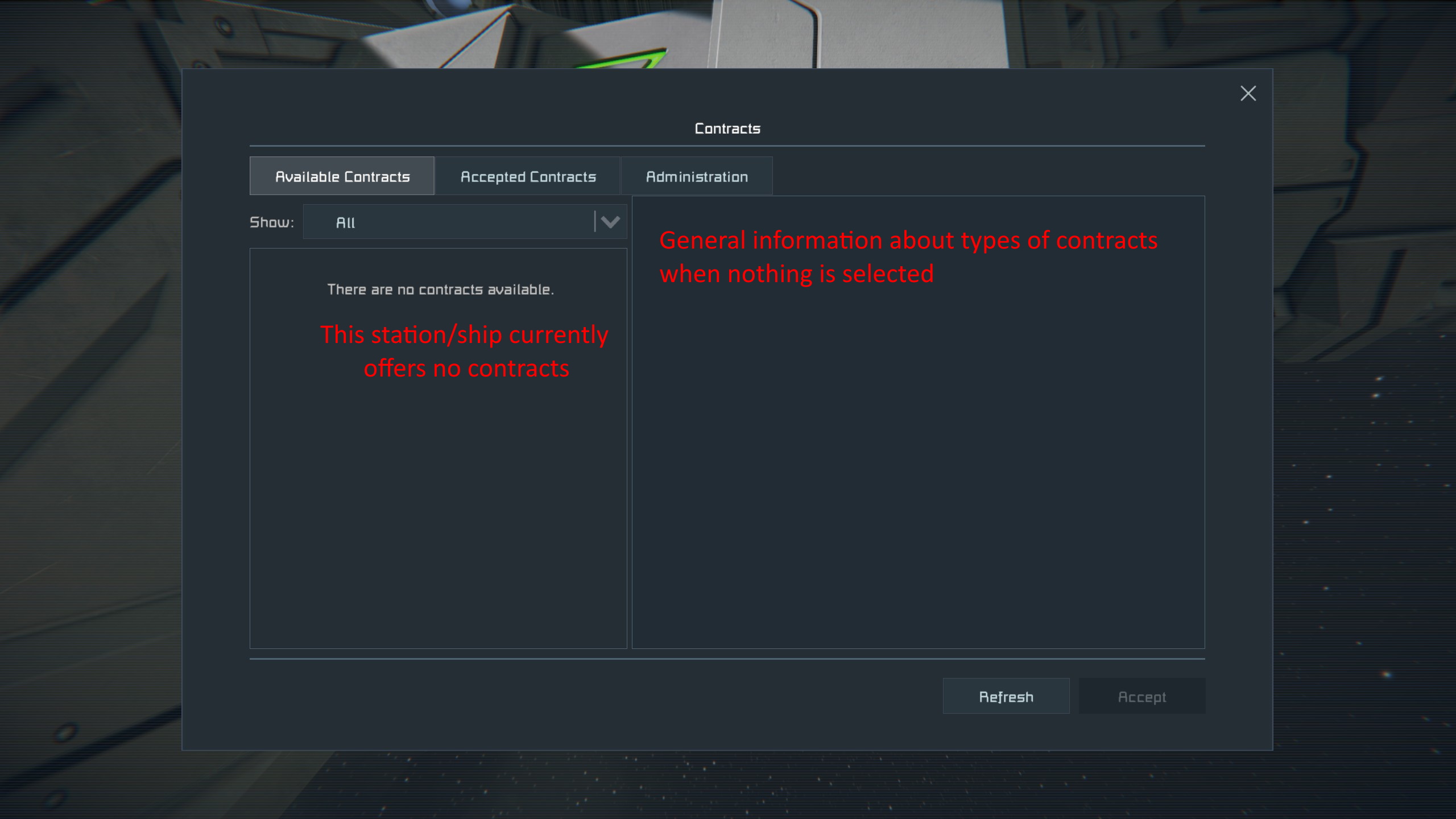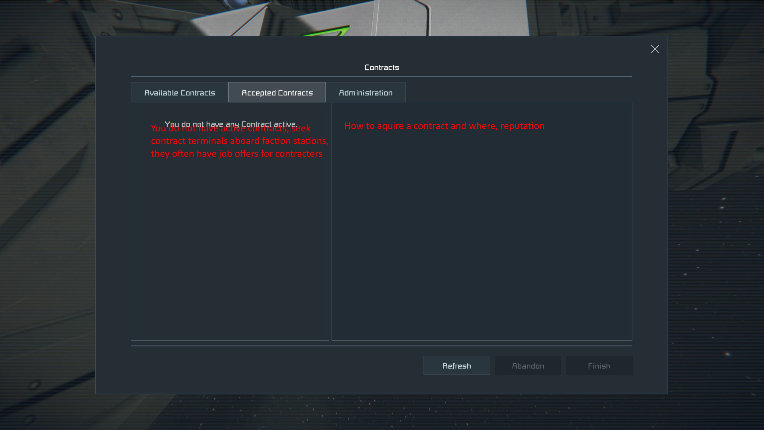 - Avaliable contracts: list was empty and claimed that there is no contracts avaliable. But does it mean that there are no contracts on this specific grid, in my faction or that I don't know contacts that brodcasted contracts to me?