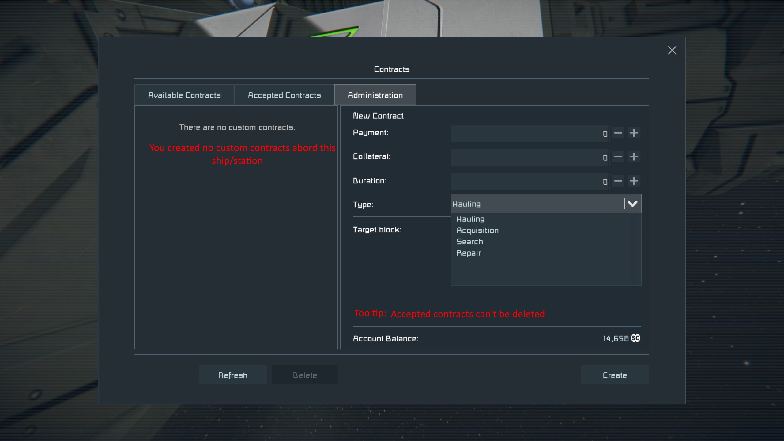 - Administration->new contracts->types: Repair contract is probably the only one obvious. Search probably species around what to search, but it doesn't seem to specify what to search for. Is it searching for grids? Ores? Asteroids? Hauling - does it haul only grids? There seem to be no waypoints to set destination. Repair and Aquisition are more clear, but still will be usefull to have more info either as tooltips or text in free space. For example Hauling wants me to specify a grid, but what do it want the grid specified for? A place to unload resources? A place to load them? And how much should I pay to haul something from A to B? * and list seems rather small, I won't mind hiring someone to deal with pesky 'hidden pirate base' near me)