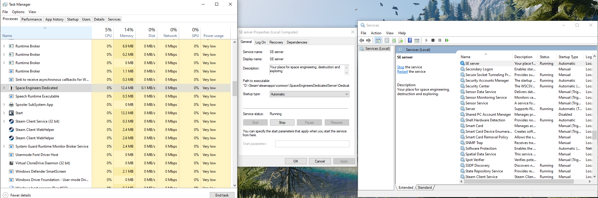 As the title suggests, the dedicated server is automatically starting with Windows 10 when I boot my computer. I never changed any settings for it to do that, so I'm assuming that when your service installs it doesn't have any specific programming for the service to choose when and how it starts. Maybe you could figure out something so that it gets set to a manual start, so that when you launch the server tool from steam it would start the service, and then stop it when you close the server? As of now, even if I set it to manual, if I've done anything with the server files or reset the files then the service sets itself back to automatic after running the server tool on steam. I'm assuming that this is a problem with the tool simply because it's the only service that does this, and I've noticed that it sometimes can take up to 3GB of memory while doing nothing (I hope). I have the latest versions of Windows 10, Steam, Space Engineers, and the Space Engineers Dedicated Server Tool.