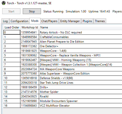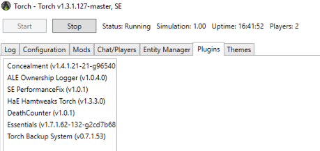 Server info: Windows server 2016, latest version of Torch (v1.3.1.127) and latest SE version, running experimental mode. In case relevant, mods and plugins used in Torch listed in screenshots.