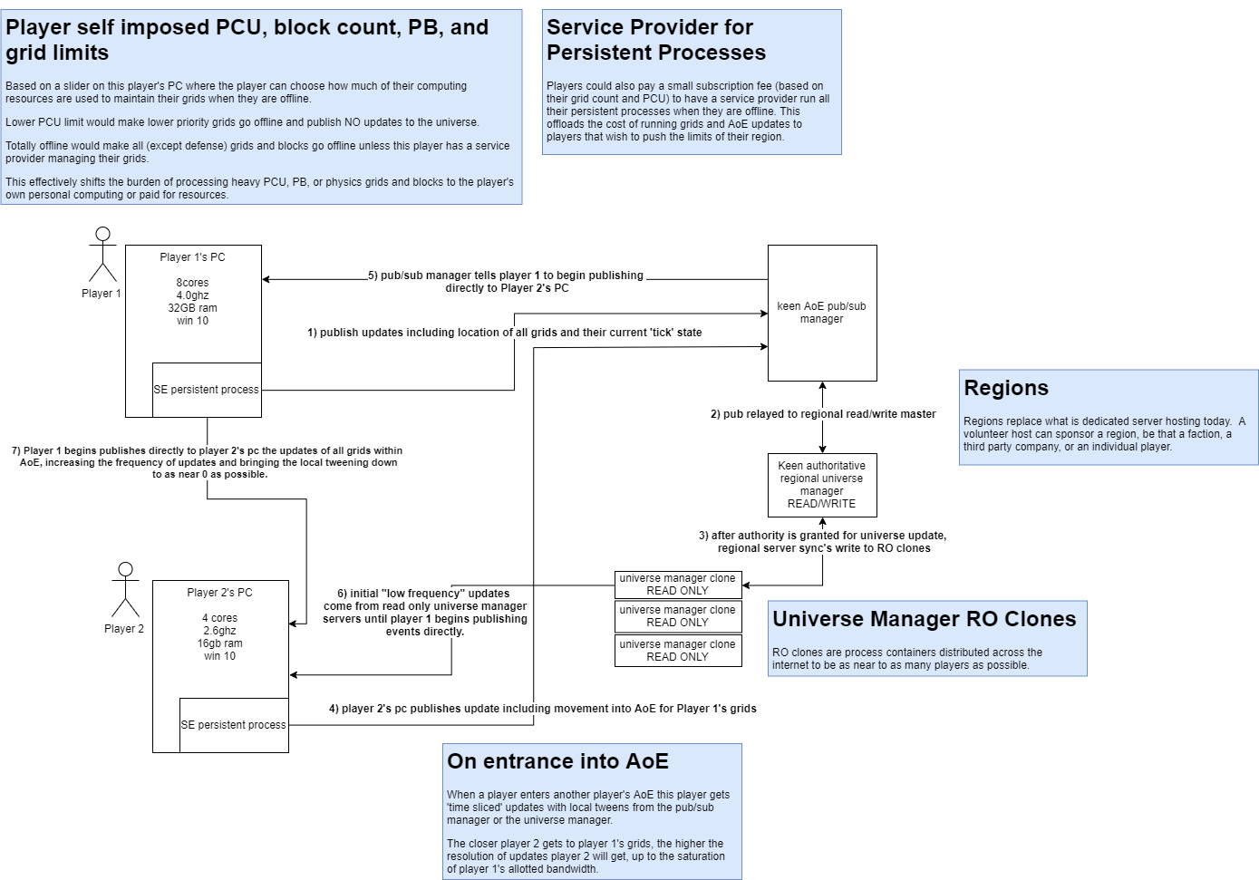 Fast forward nearly 10 years and I believe that for SE to reach the mmo level of scale cost effectively, this type of architecture could be applied. An architecture where individual players cannot affect the experience of others and thousands could be online simultaneously. An architecture which pushes the cost and burden considerations of a player's creations onto the creator of those things.