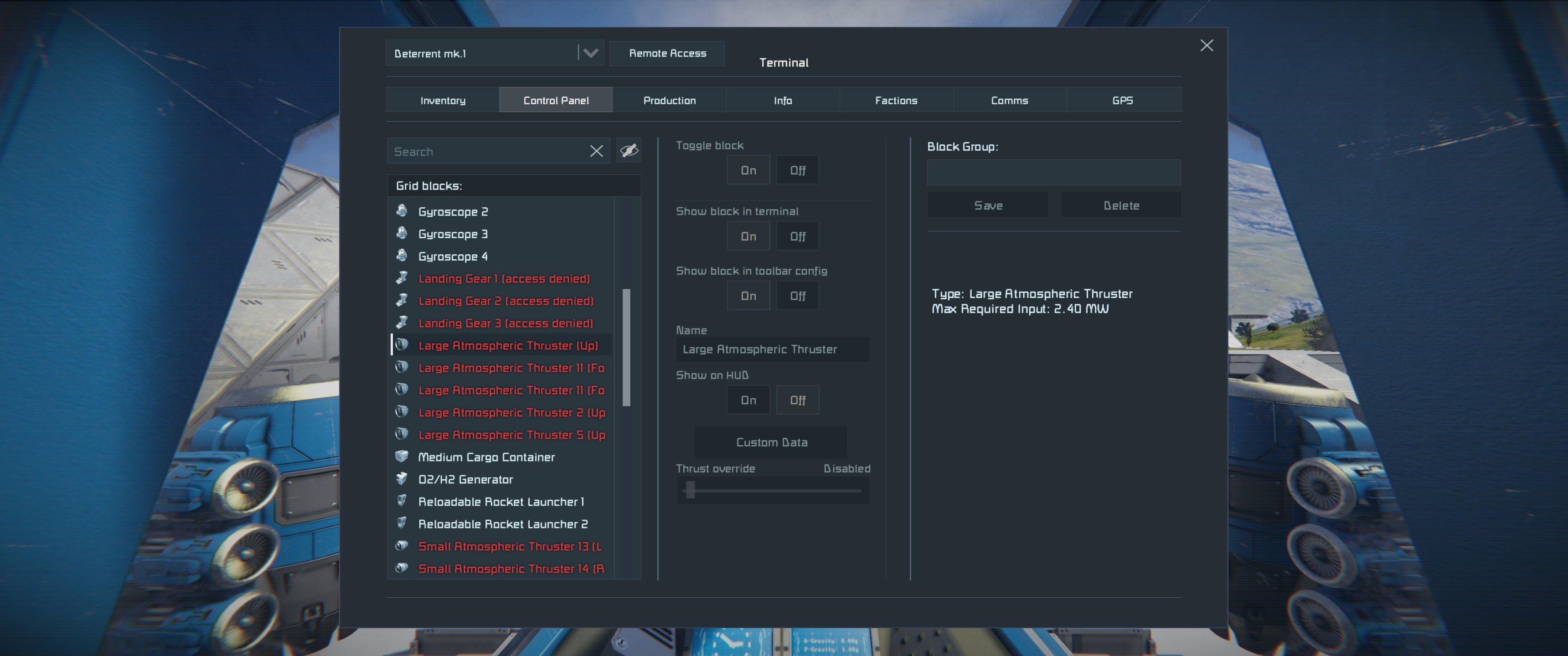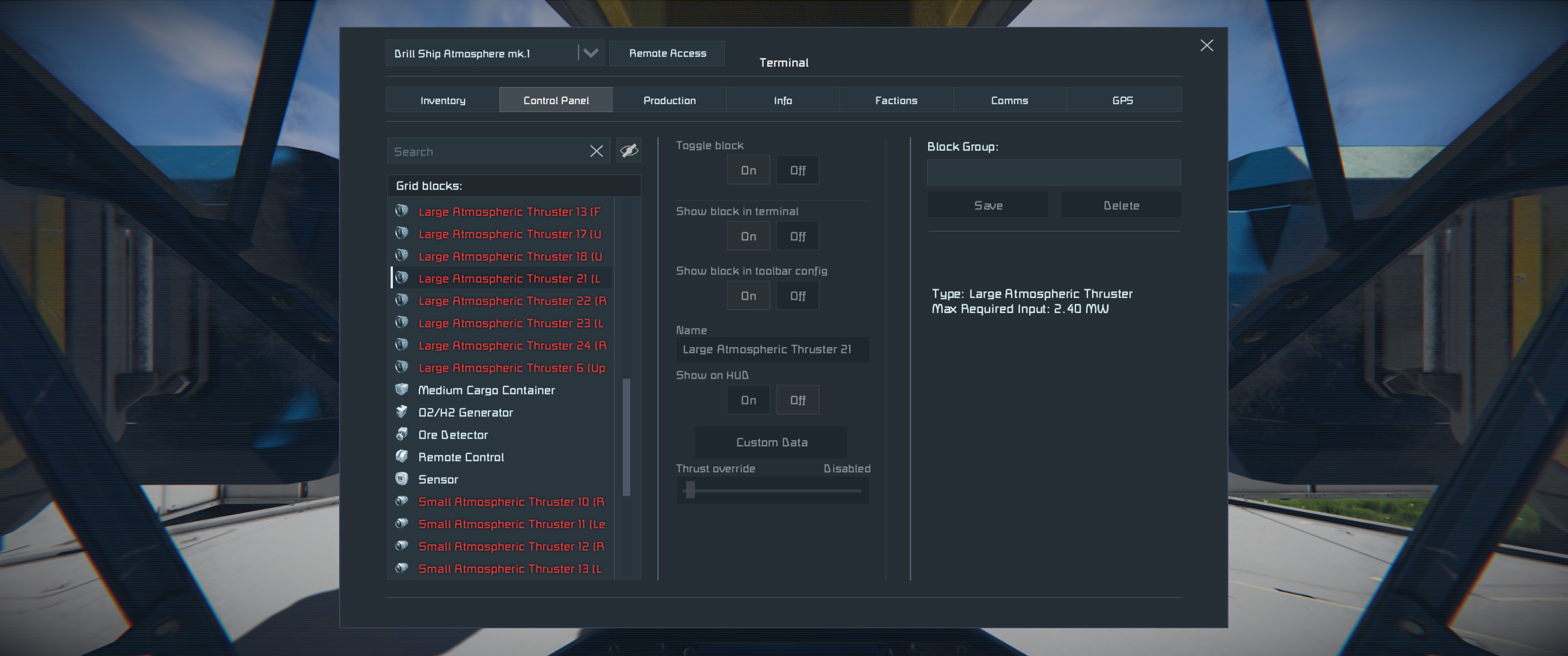 - Drill Ship Atmosphere mk.1: access denied on Landing Gear, Thrusters, Spotlight