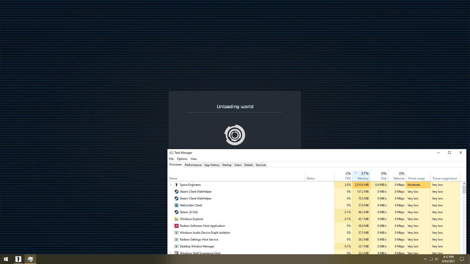 Cannot just let Space Engineers run. I have let it run for 3 hours, and it never unloads. In task manager it shows its at about 4500 MB of memory at the time of the lockup. It dwindles down to about 1100 MB, but never lower. I'd send a save, but since it gets damaged, and then removed by error check, I can't.