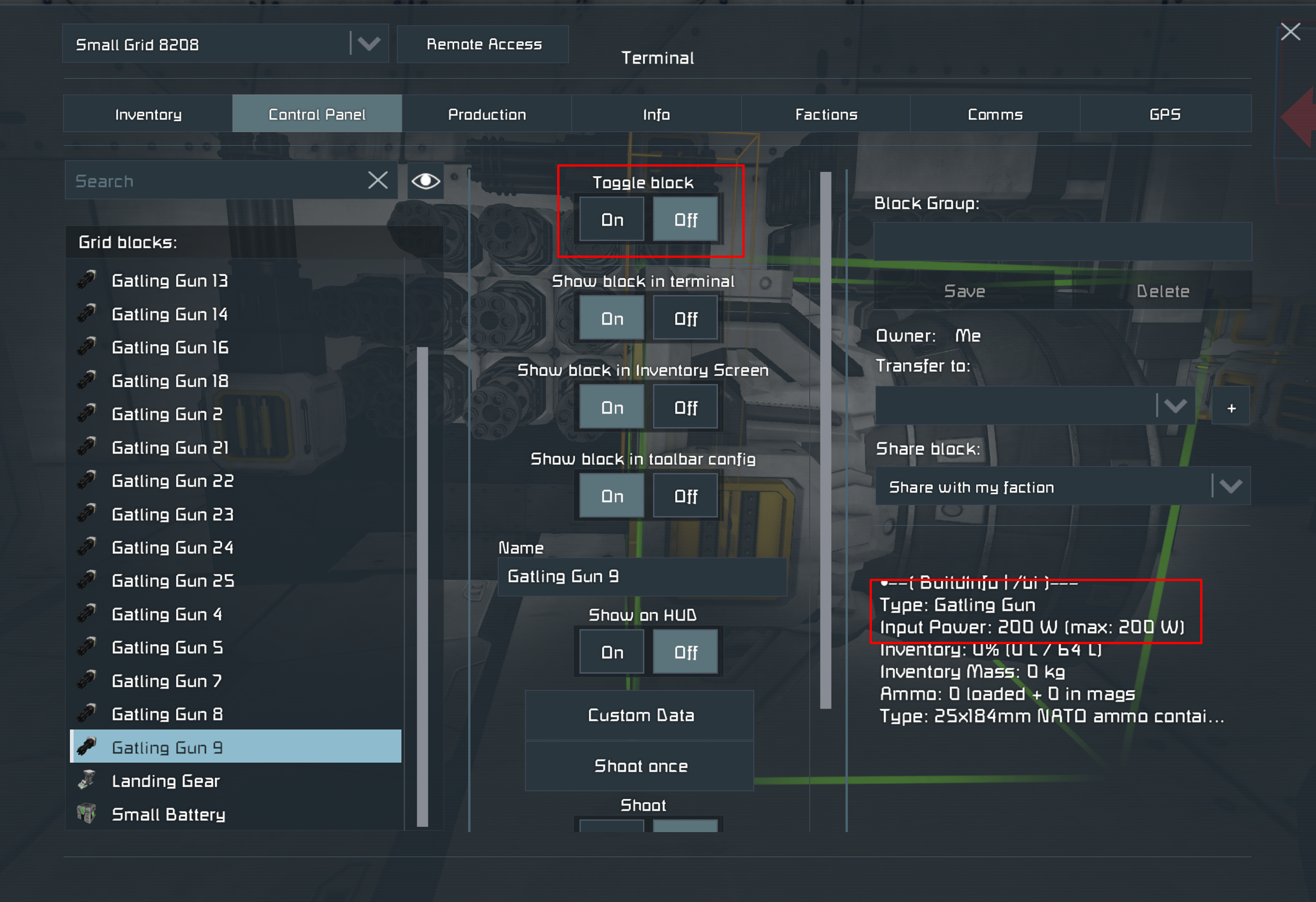 Trying to make pallets with stuff on them for my hangar but ran into a weird issue not sure if bugged or intended but Gatling Guns use power when turned off apparently.