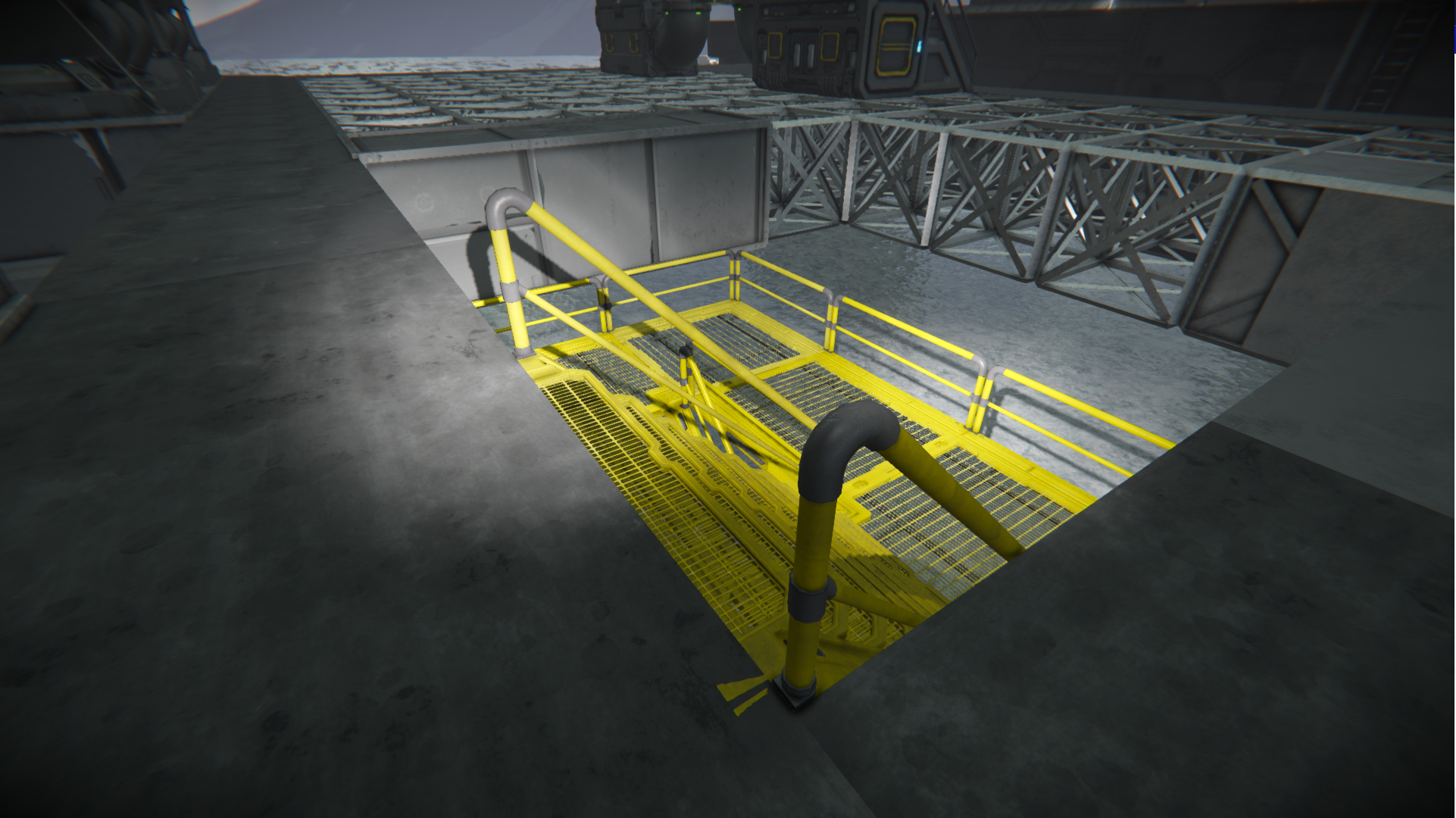 Grated Stairs 9Catwalk stairs) placed with the top connection a beam block (I beam blocks from Heavy Industries DLC). At the top, on each side is a post from the railing to the floor. It paints properly on the stairs. However, there is ghosting of pixels on each of the railings the clips into the beam block